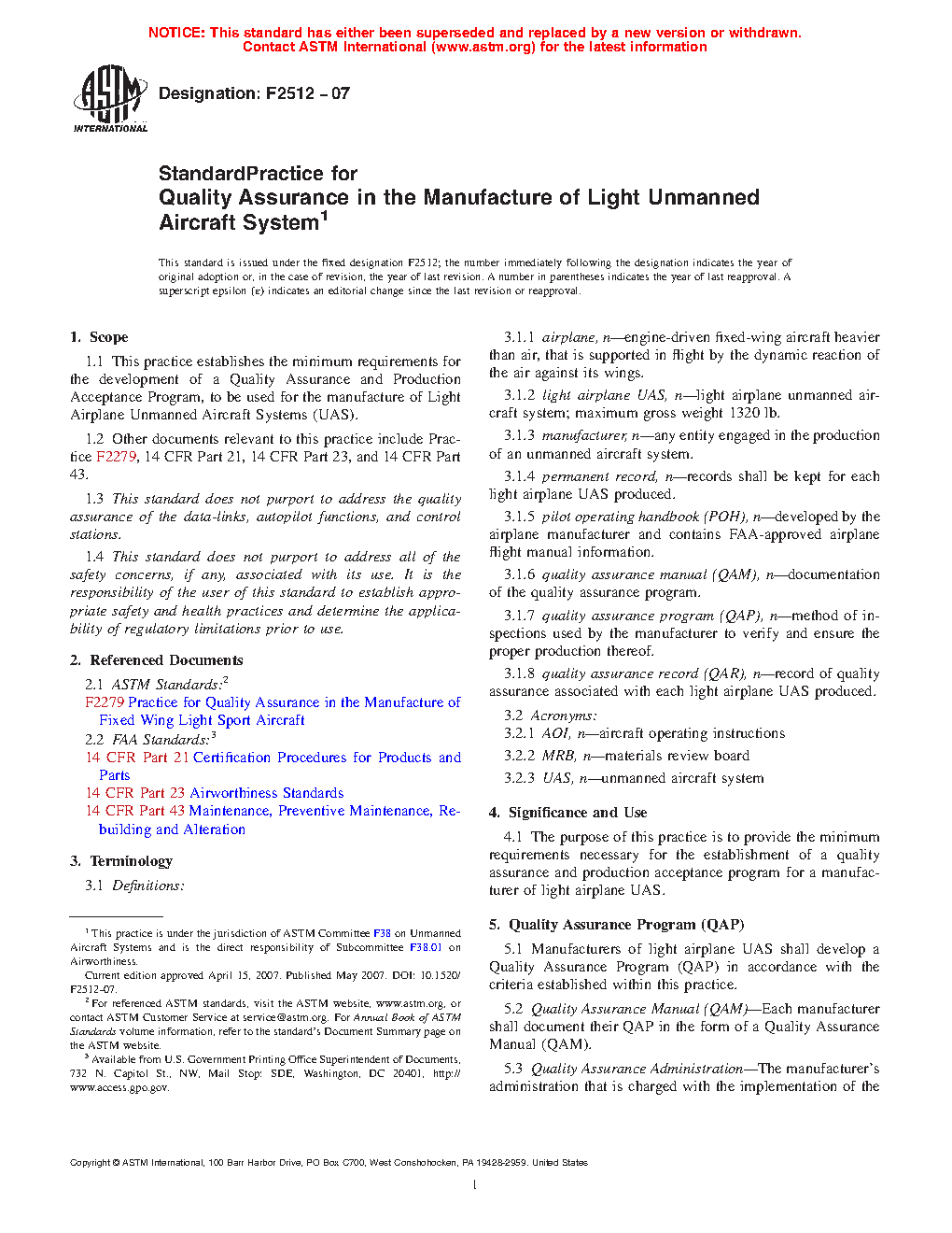 The purpose of this practice is to provide the minimum requirements necessary for the establishment of a quality assurance and production acceptance program for a manufacturer of light airplane UAS.