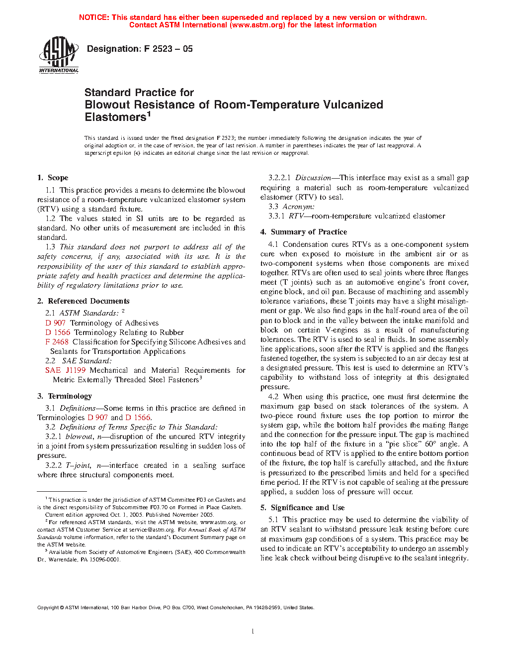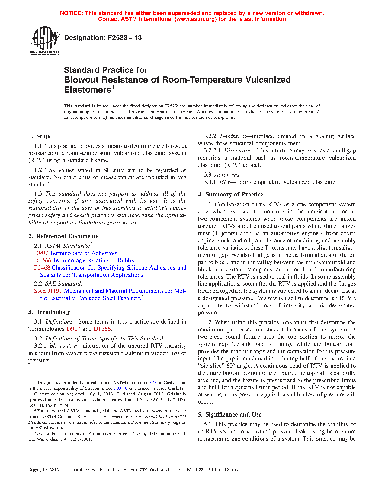 5.1 This practice may be used to determine the viability of an RTV sealant to withstand pressure leak testing before cure at maximum gap conditions of a system. This practice may be used to indicate an RTV’s acceptability to undergo an assembly line leak check without causing a leak path due to material blow out.