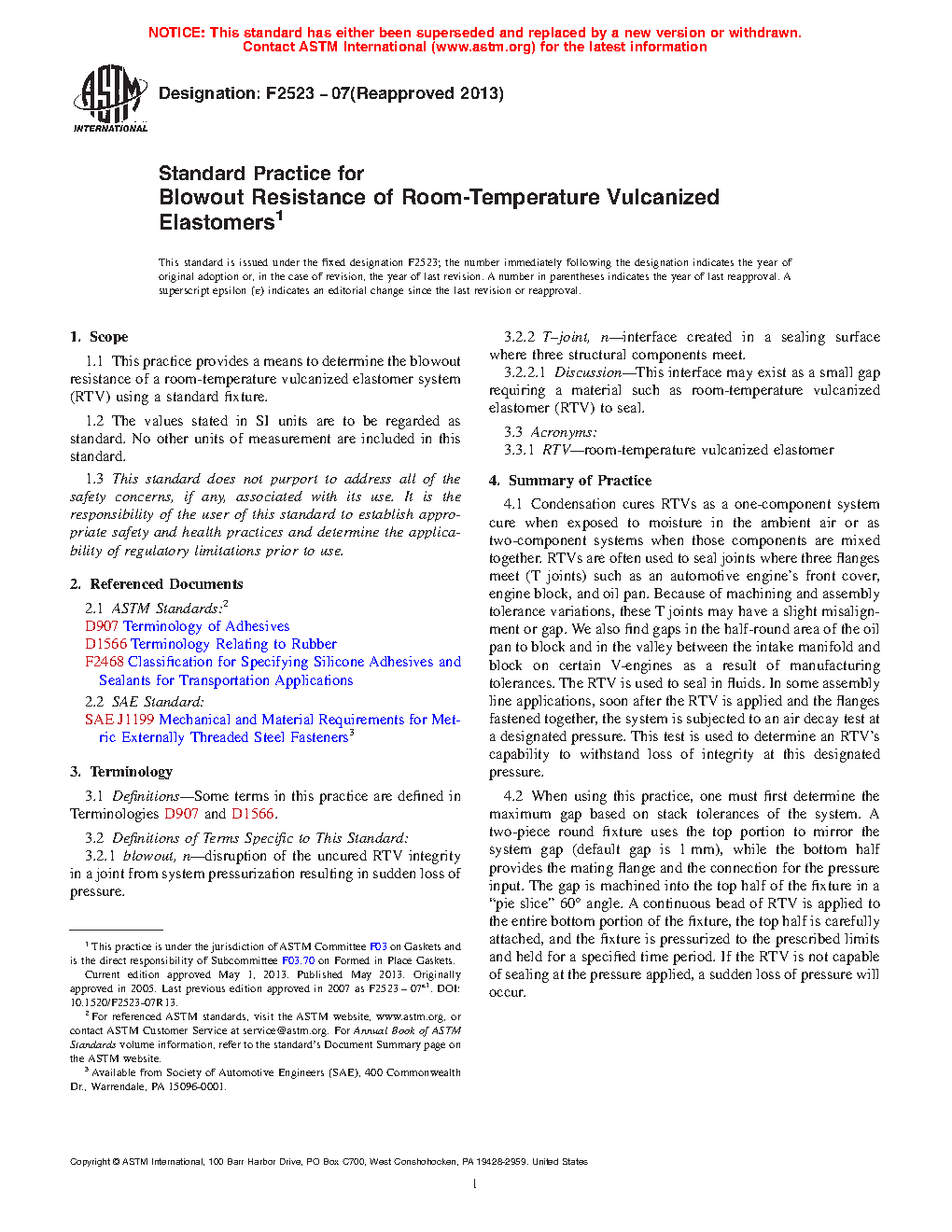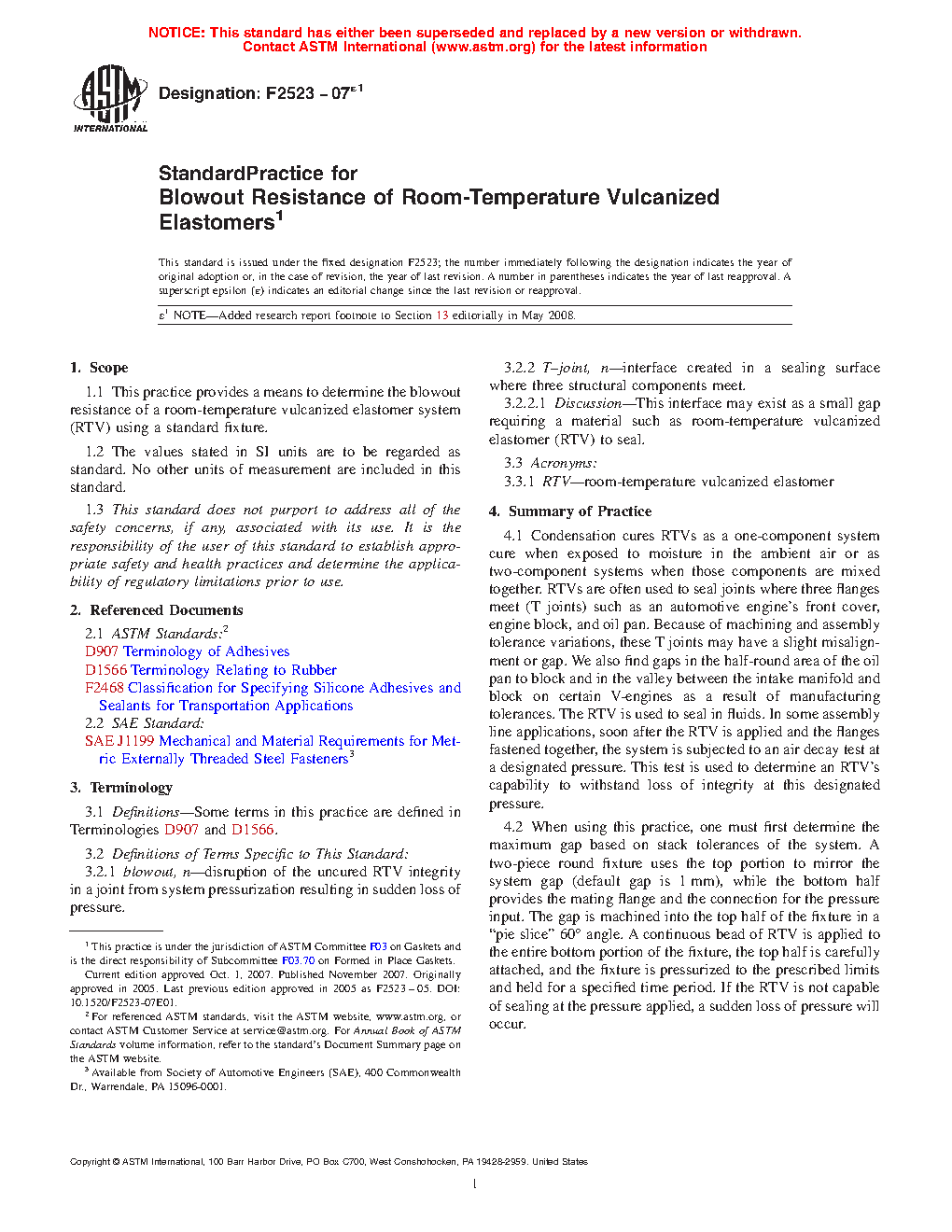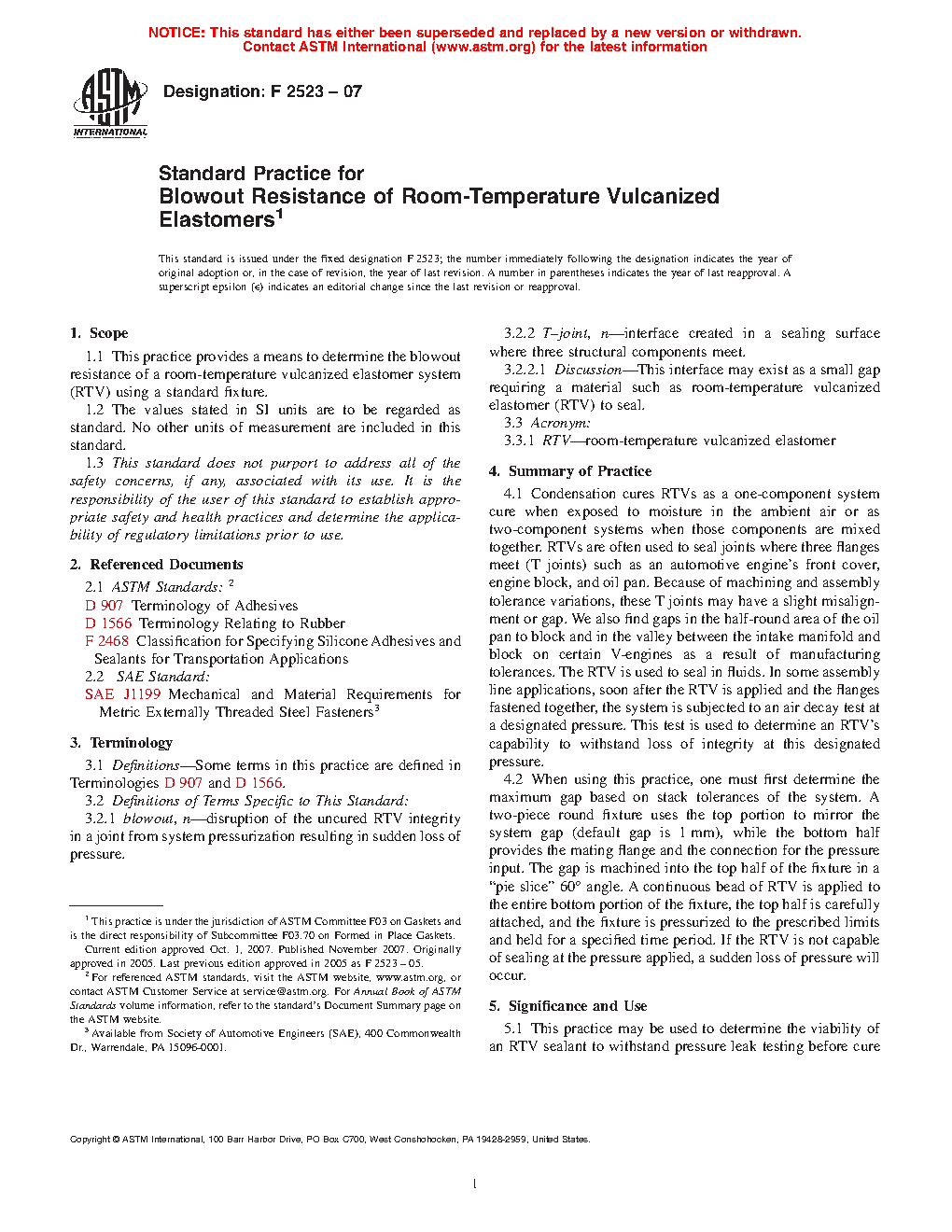1.1 This practice provides a means to determine the blowout resistance of a room-temperature vulcanized elastomer system (RTV) using a standard fixture.