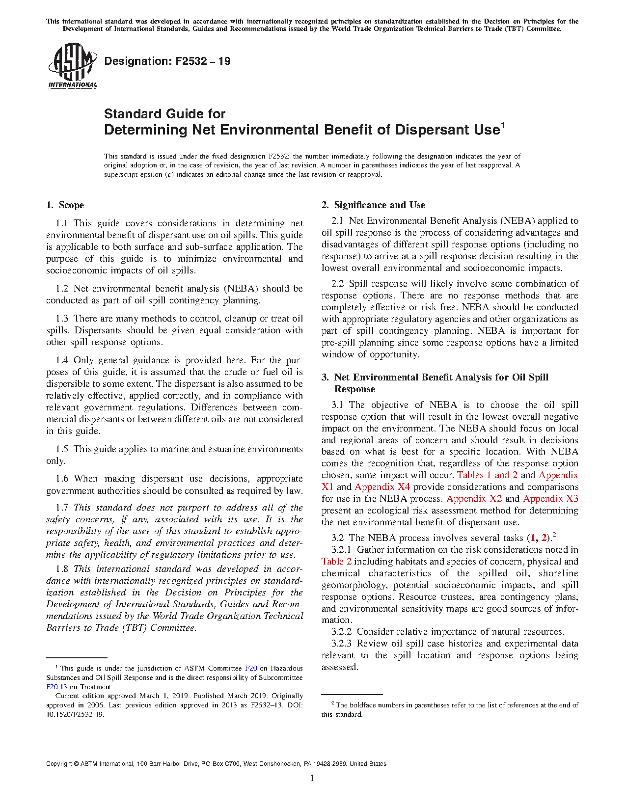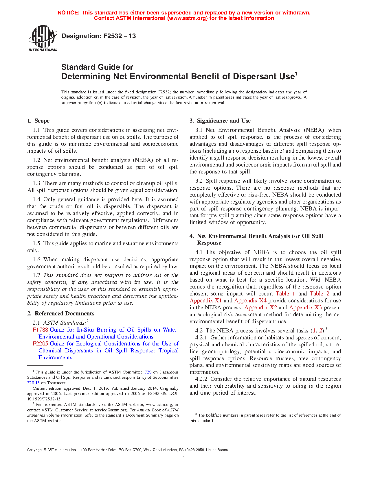 1.1 This guide covers considerations in determining net environmental benefit of dispersant use on oil spills. This guide is applicable to both surface and sub-surface application. The purpose of this guide is to minimize environmental and socioeconomic impacts of oil spills.