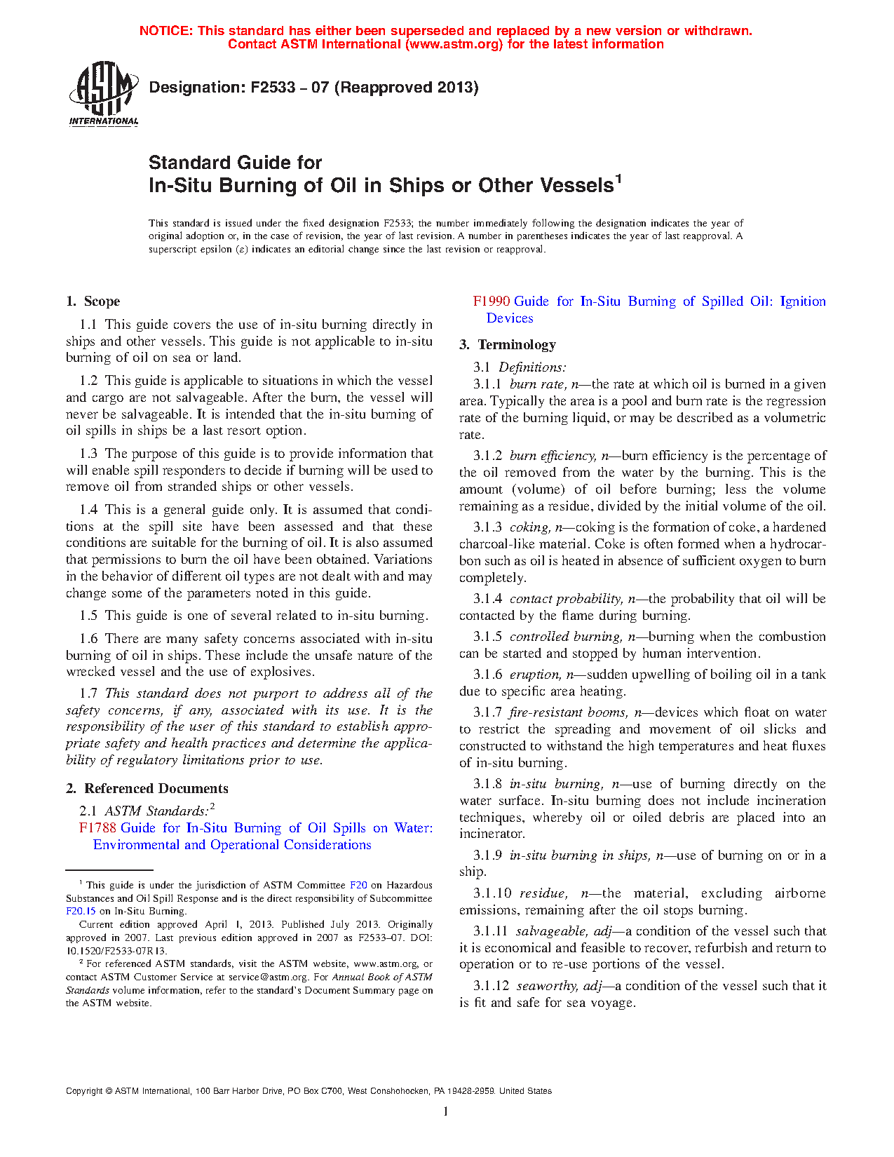 1.1 This guide covers the use of in-situ burning directly in ships and other vessels. This guide is not applicable to in-situ burning of oil on sea or land.