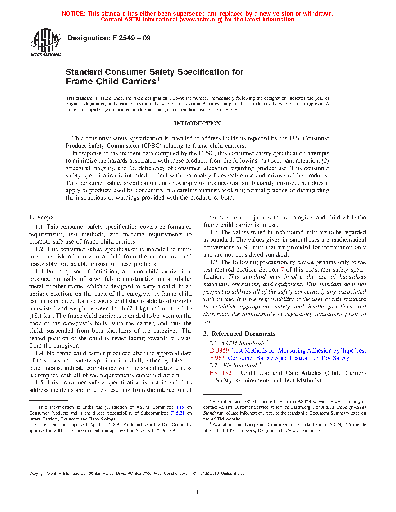 1.1 This consumer safety specification covers performance requirements, test methods, and marking requirements to promote safe use of frame child carriers.
