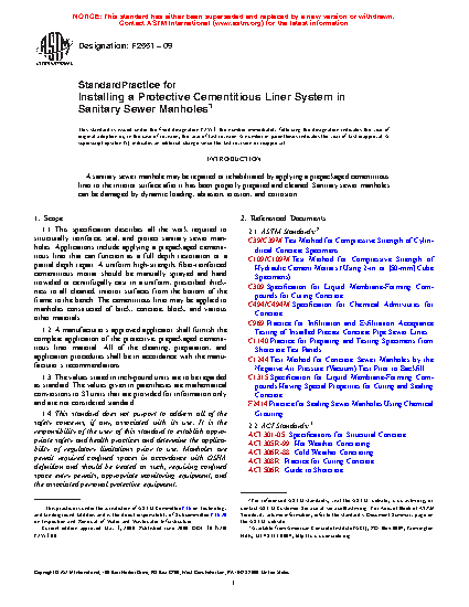This practice describes the procedures involved in the structural reinforcement, sealing, protection, and rehabilitation of sanitary sewer manholes by the application of a prepackaged protective cementitious liner system to all cleaned interior surface from the bottom of the frame to the bench. The manholes to which the cementitious liner shall be applied may be made of brick, concrete, block, and various other materials. Detailed descriptions are given for all prepackaged materials necessary for this practice that include materials for substrate repairs, cementitious repair materials, infiltration water control materials, cementitious water control materials, chemical grout materials, and lining materials. Detailed descriptions are also provided for each procedure involved here which includes surface preparation, high pressure cleaning, surface repair, mixing of prepackaged cementitious repair materials, spray application of the cement liner by manual surface sealing or centrifugal cast process, and curing of the freshly applied cementitious mortar.