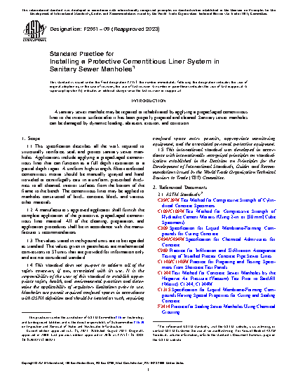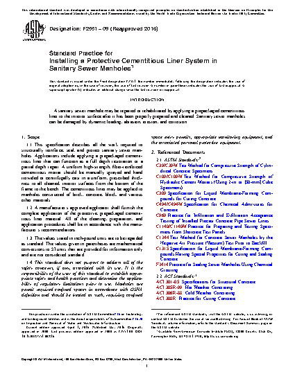 1.1 This specification describes all the work required to structurally reinforce, seal, and protect sanitary sewer manholes. Applications include applying a prepackaged cementitious liner that can function as a full depth restoration or a partial depth repair. A uniform high-strength, fiber-reinforced cementitious mortar should be manually sprayed and hand troweled or centrifugally cast in a uniform, prescribed thickness to all cleaned, interior surfaces from the bottom of the frame to the bench. The cementitious liner may be applied to manholes constructed of brick, concrete, block, and various other materials.
