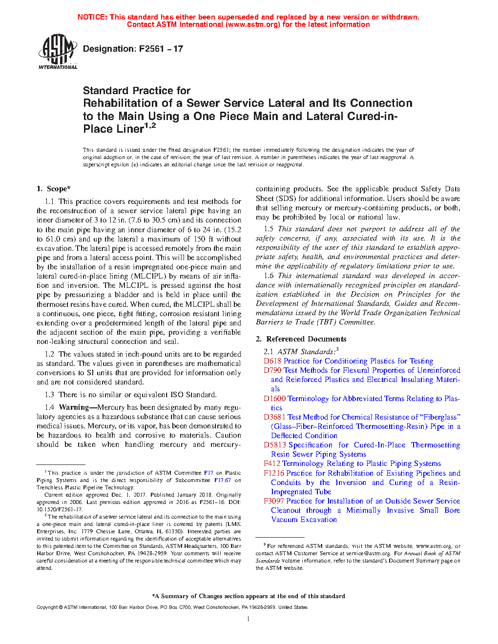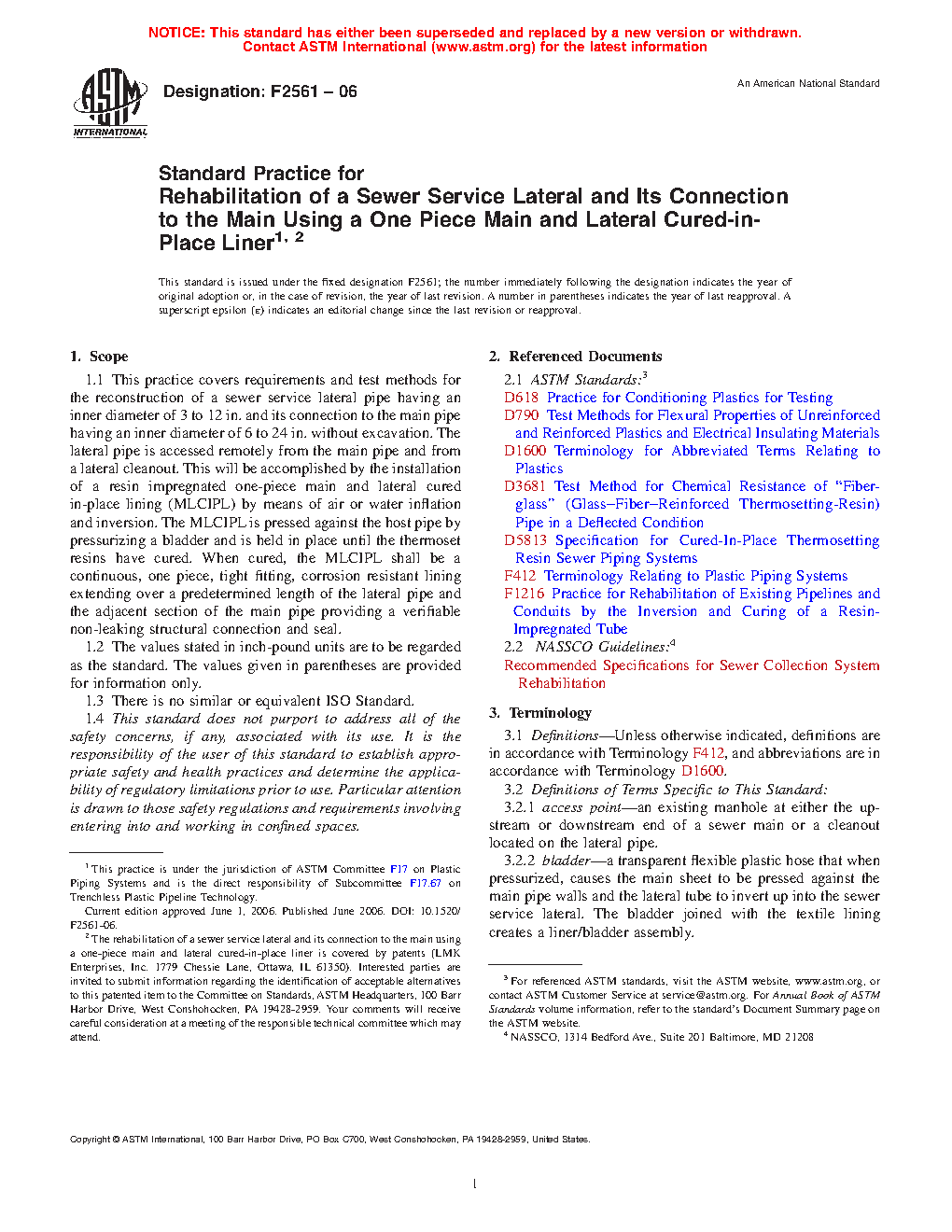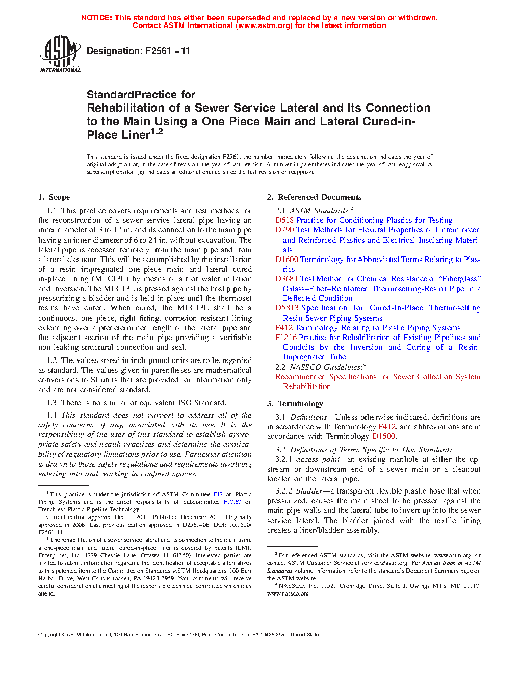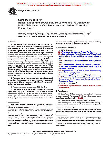 1.1 This practice covers requirements and test methods for the reconstruction of a sewer service lateral pipe having an inner diameter of 3 to 12 in. (7.6 to 30.5 cm) and its connection to the main pipe having an inner diameter of 6 to 24 in. (15.2 to 61.0 cm) and up the lateral a maximum of 150 ft without excavation. The lateral pipe is accessed remotely from the main pipe and from a lateral access point. This will be accomplished by the installation of a resin impregnated one-piece main and lateral cured-in-place lining (MLCIPL) by means of air inflation and inversion. The MLCIPL is pressed against the host pipe by pressurizing a bladder and is held in place until the thermoset resins have cured. When cured, the MLCIPL shall be a continuous, one piece, tight fitting, corrosion resistant lining extending over a predetermined length of the lateral pipe and the adjacent section of the main pipe, providing a verifiable non-leaking structural connection and seal.