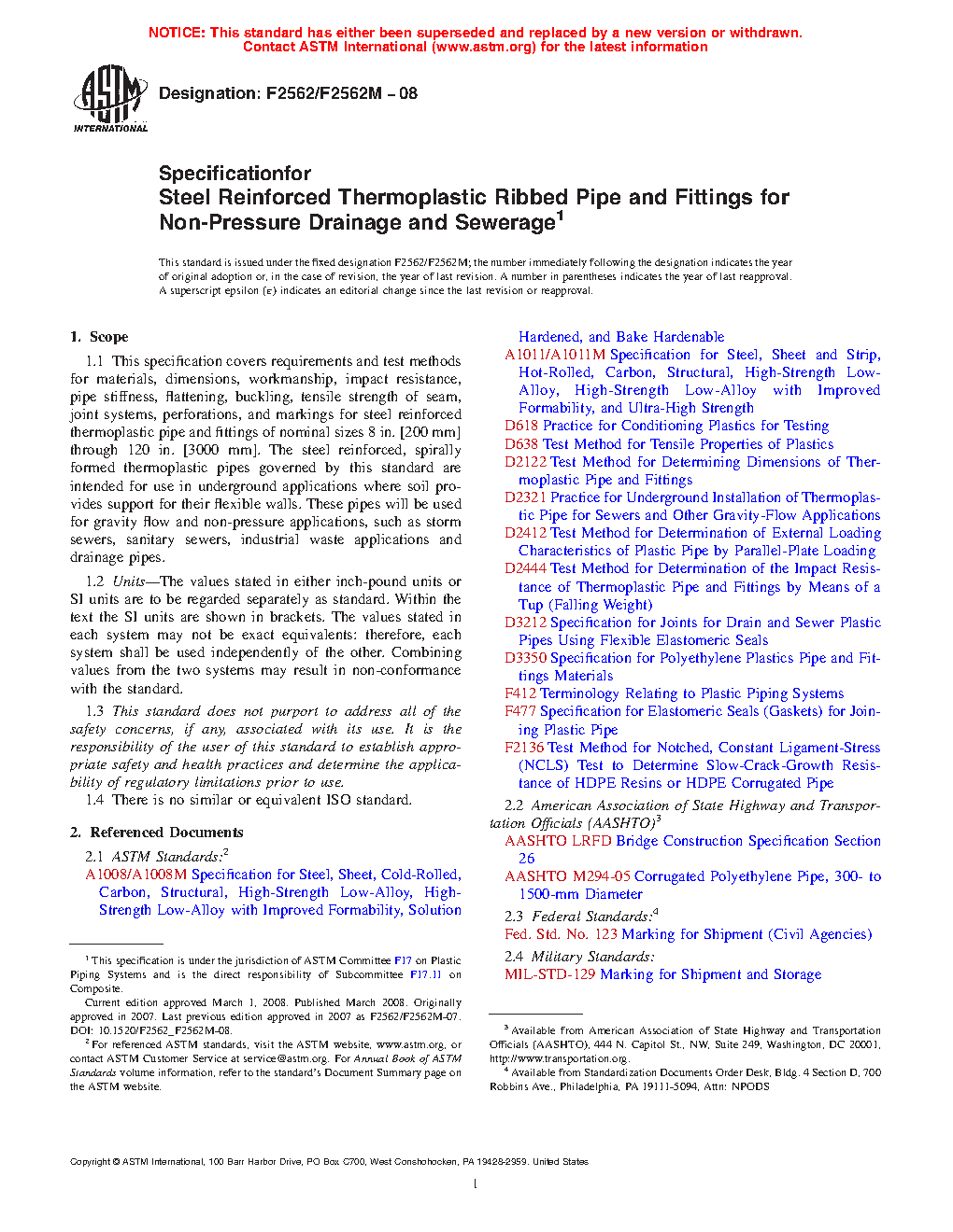 This specification covers requirements and test methods for materials, dimensions, workmanship, impact resistance, pipe stiffness, flattening, buckling, tensile strength of seam, joint systems, perforations, and markings for steel reinforced thermoplastic pipe and fittings. The steel reinforced, spirally formed thermoplastic pipes are intended for use in underground applications where soil provides support for their flexible walls. These pipes will be used for gravity flow and non-pressure applications, such as storm sewers, sanitary sewers, industrial waste applications and drainage pipes. The pipe dimensions, pipe stiffness, flattening, impact resistance, tensile strength of seam, and joint tightness shall be tested to meet the requirements prescribed.