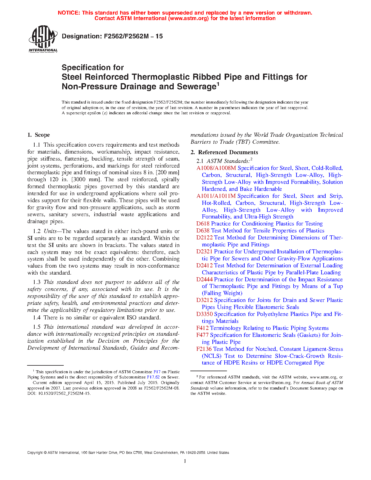 1.1 This specification covers requirements and test methods for materials, dimensions, workmanship, impact resistance, pipe stiffness, flattening, buckling, tensile strength of seam, joint systems, perforations, and markings for steel reinforced thermoplastic pipe and fittings of nominal sizes 8 in. [200 mm] through 120 in. [3000 mm]. The steel reinforced, spirally formed thermoplastic pipes governed by this standard are intended for use in underground applications where soil provides support for their flexible walls. These pipes will be used for gravity flow and non-pressure applications, such as storm sewers, sanitary sewers, industrial waste applications and drainage pipes.