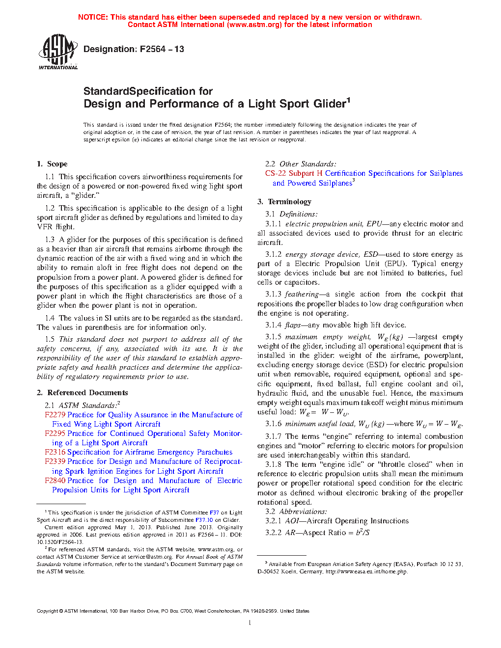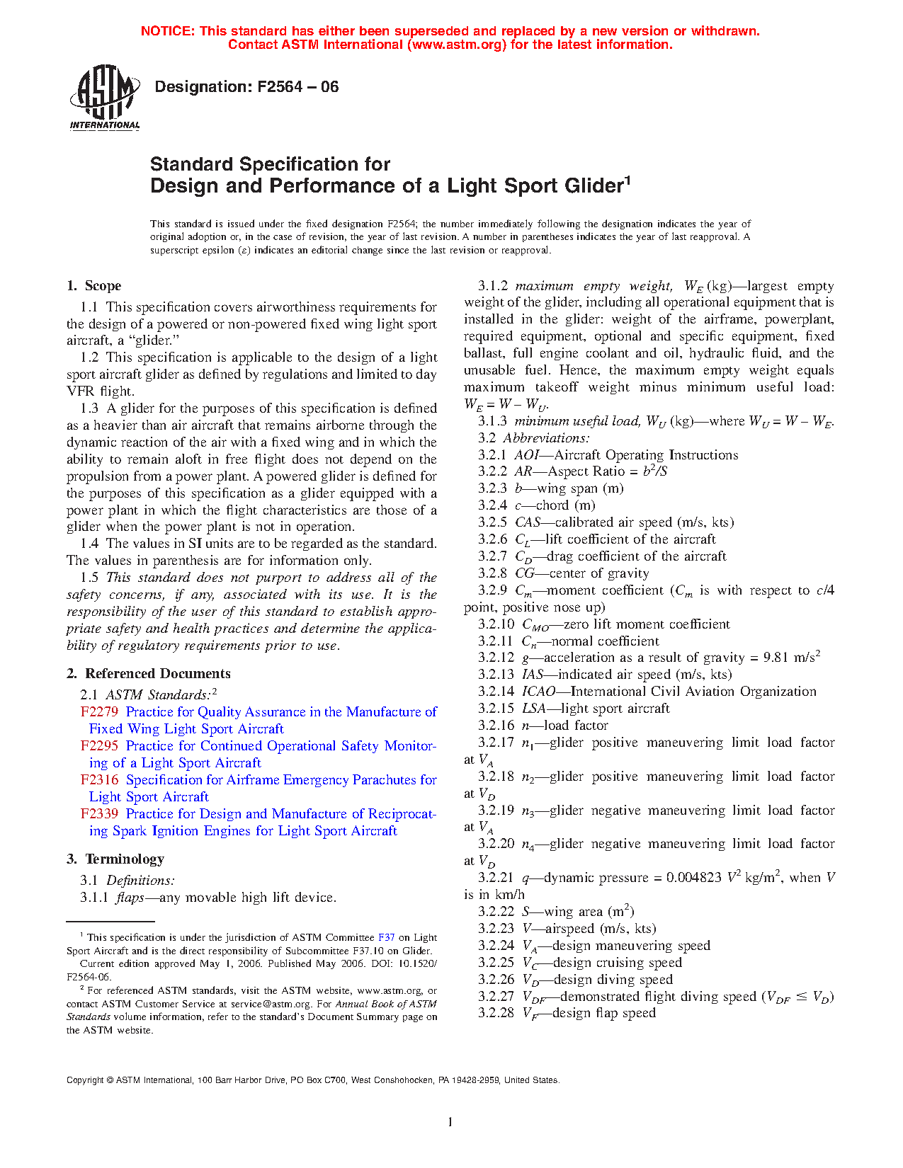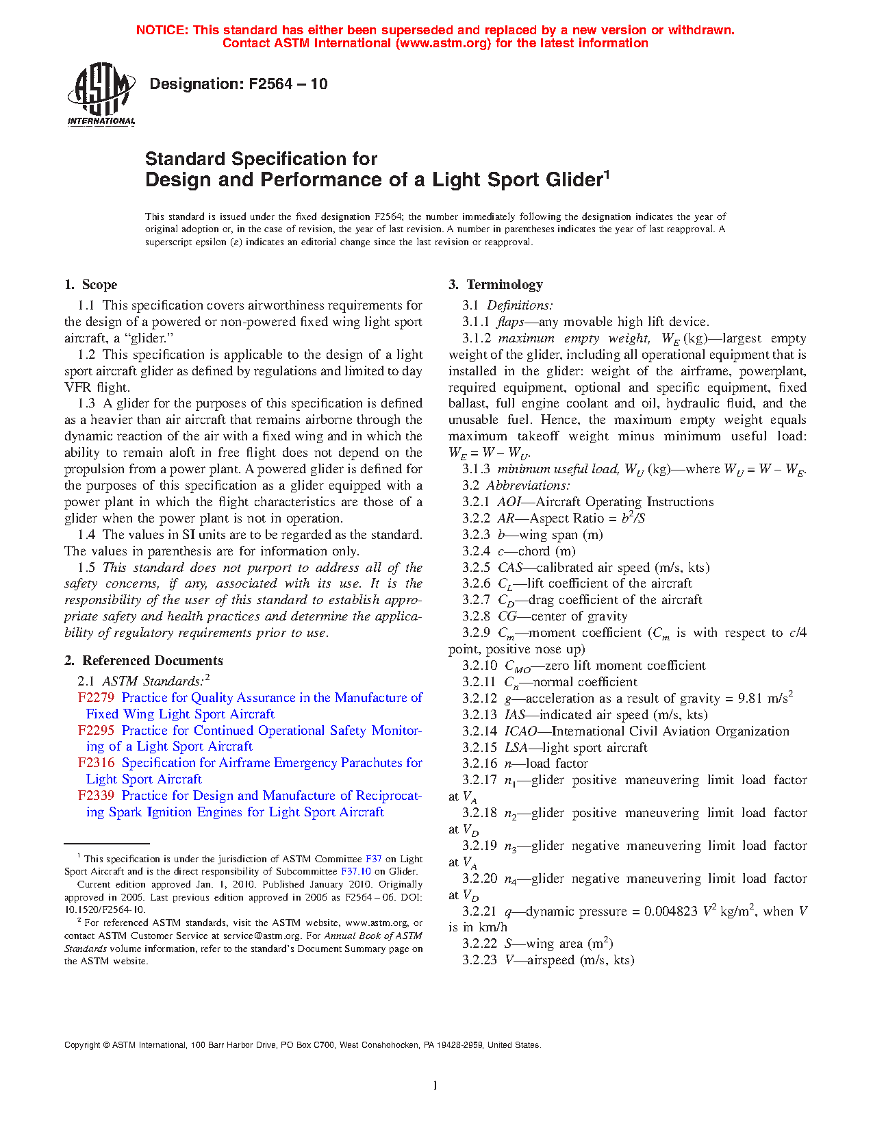 1.1 This specification covers airworthiness requirements for the design of a powered or non-powered fixed wing light sport aircraft, a “glider.”
