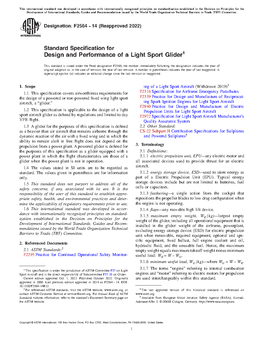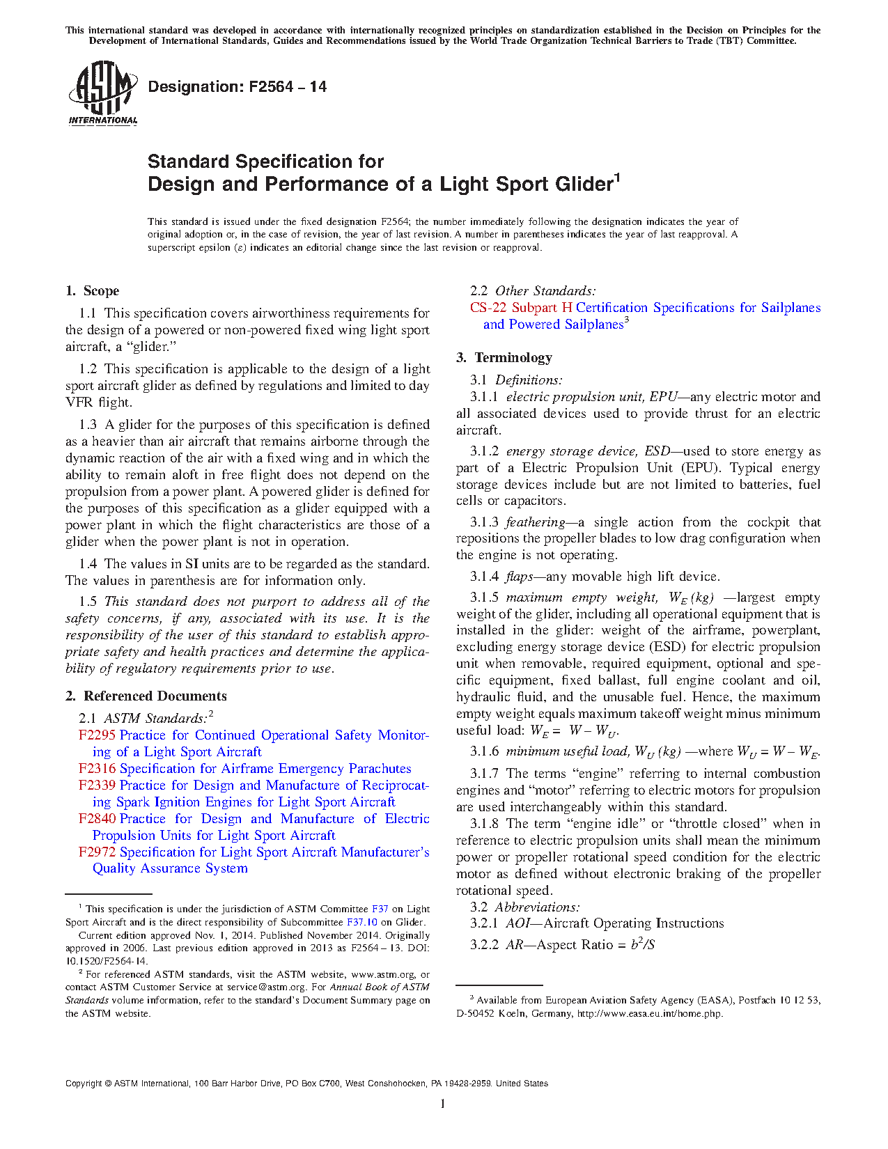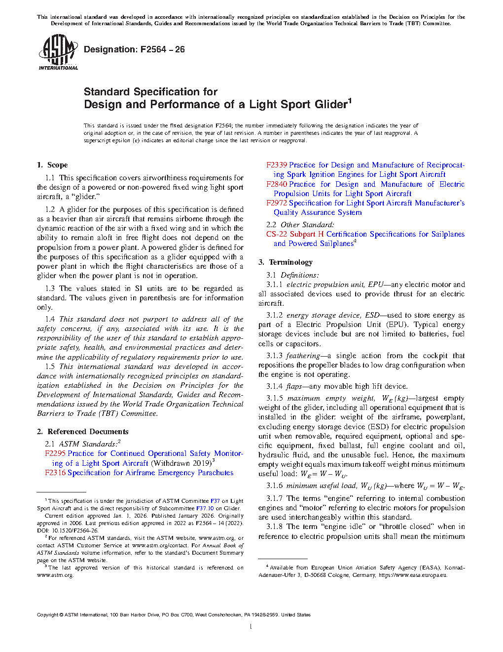 1.1 This specification covers airworthiness requirements for the design of a powered or non-powered fixed wing light sport aircraft, a “glider.”
