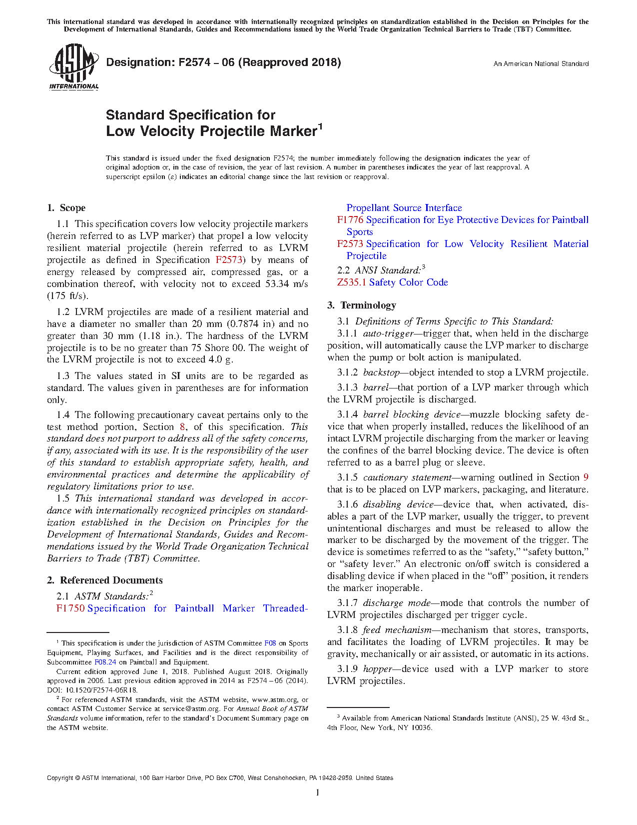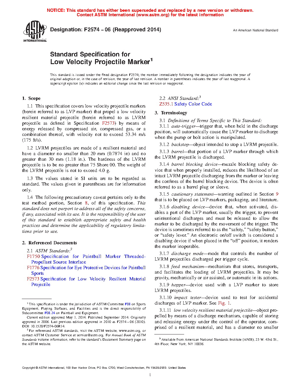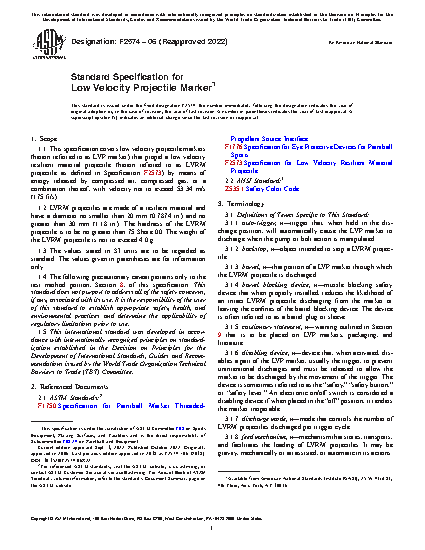 This specification covers low velocity projectile (LVP) markers that eject a low velocity resilient material (LVRM) projectile using compressed air, compressed gas, or a combination of both. Included in this specification are performance requirements and test methods for LVP markers as well as the minimum warnings and instructions that need to be provided in literature, on labels, on packaging, and on the marker itself. The LVP markers shall be manufactured to operate only in semi-automatic or pump mode and with exposed edges that shall be smooth and free of sharp edges and burrs. LVP markers shall be provided with a disabling device which shall keep it from firing and with a provision against accidental discharge. The markers shall undergo tests for disabling device, accidental discharge, barrel blocking device, and impact, and shall conform to the requirements specified.