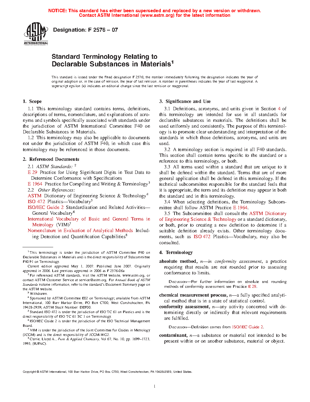 1.1 This terminology standard contains terms, definitions, descriptions of terms, nomenclature, and explanations of acronyms and symbols specifically associated with standards under the jurisdiction of ASTM International Committee F40 on Declarable Substances in Materials.