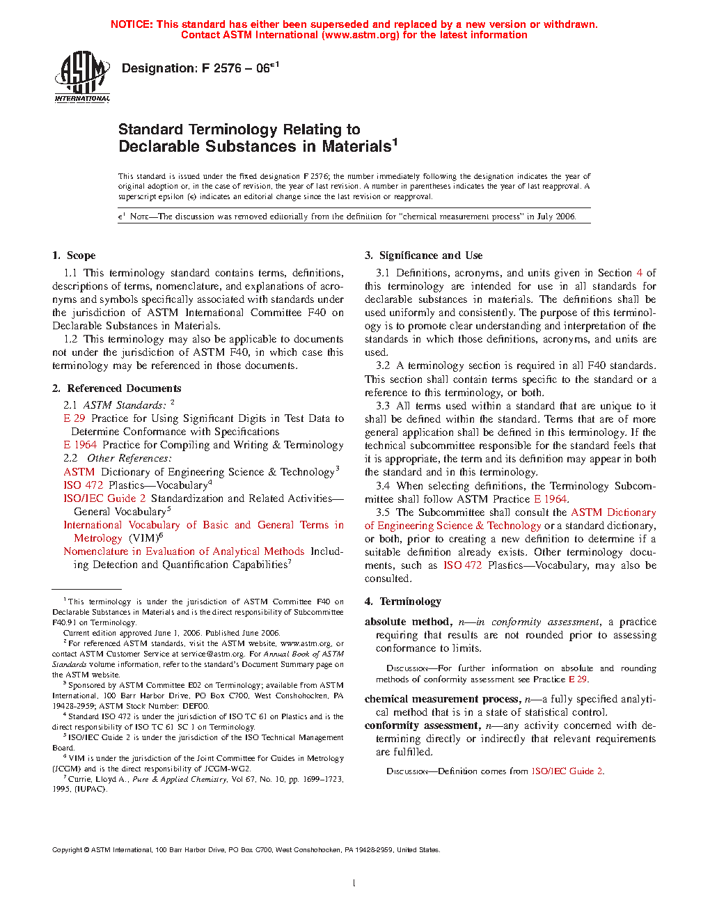 1.1 This terminology standard contains terms, definitions, descriptions of terms, nomenclature, and explanations of acronyms and symbols specifically associated with standards under the jurisdiction of ASTM International Committee F40 on Declarable Substances in Materials.