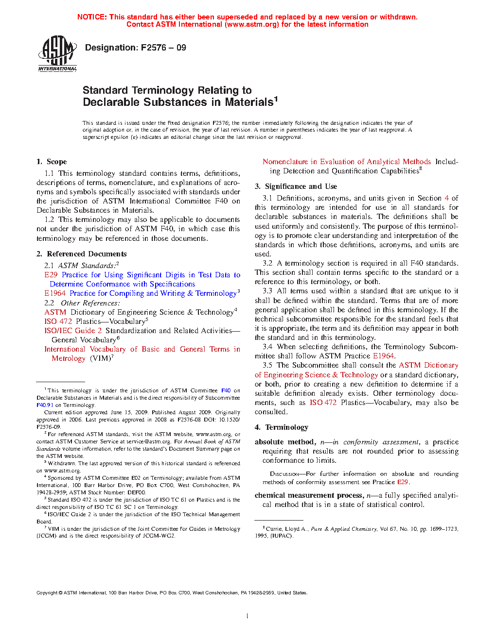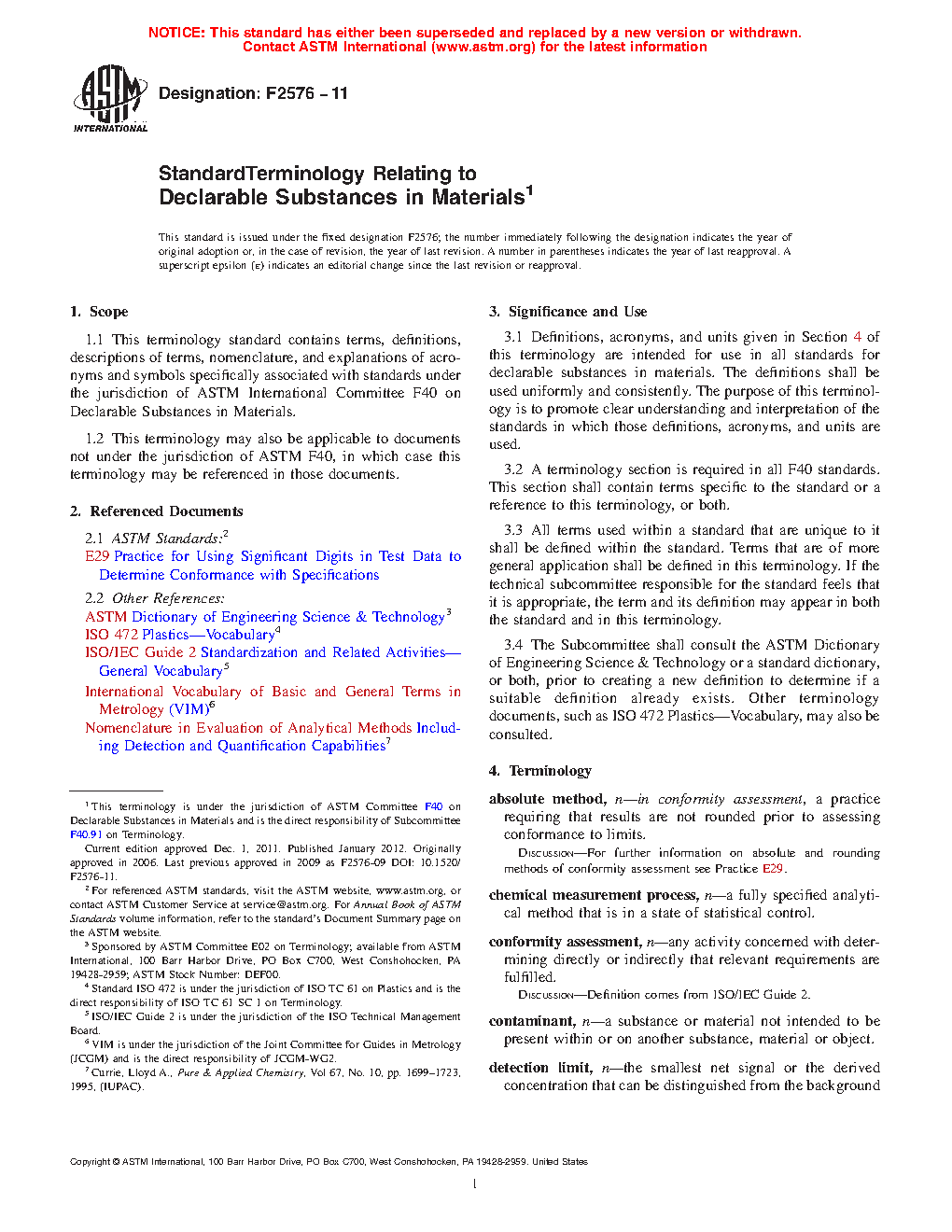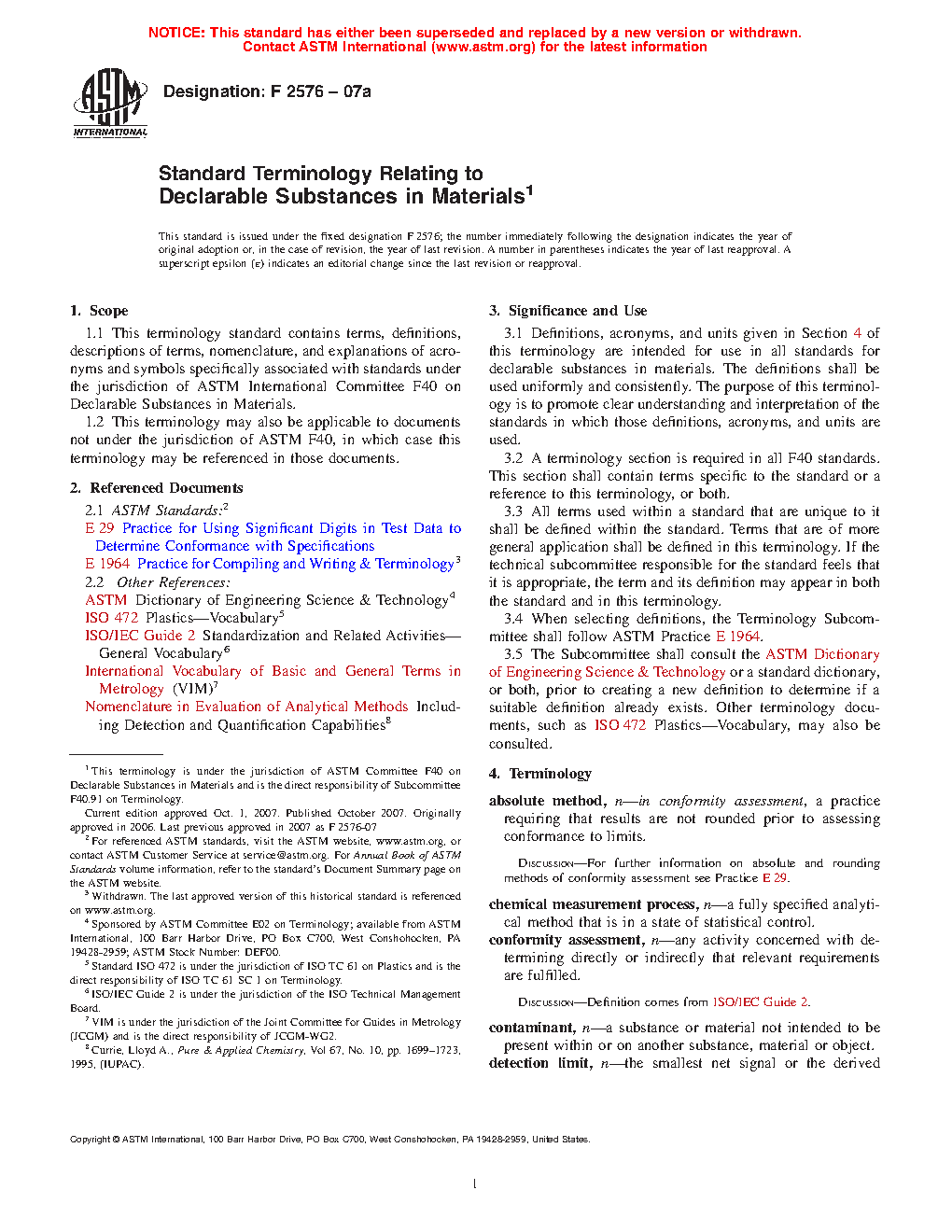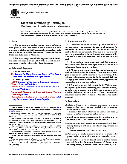 1.1 This terminology standard contains terms, definitions, descriptions of terms, nomenclature, and explanations of acronyms and symbols specifically associated with standards under the jurisdiction of ASTM International Committee F40 on Declarable Substances in Materials.
