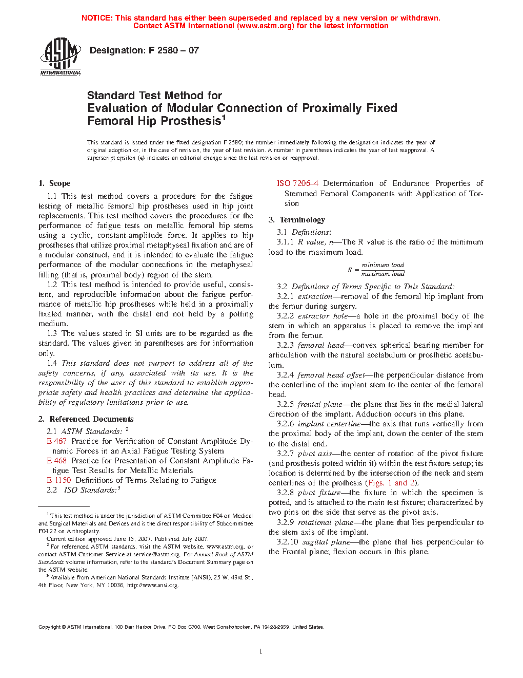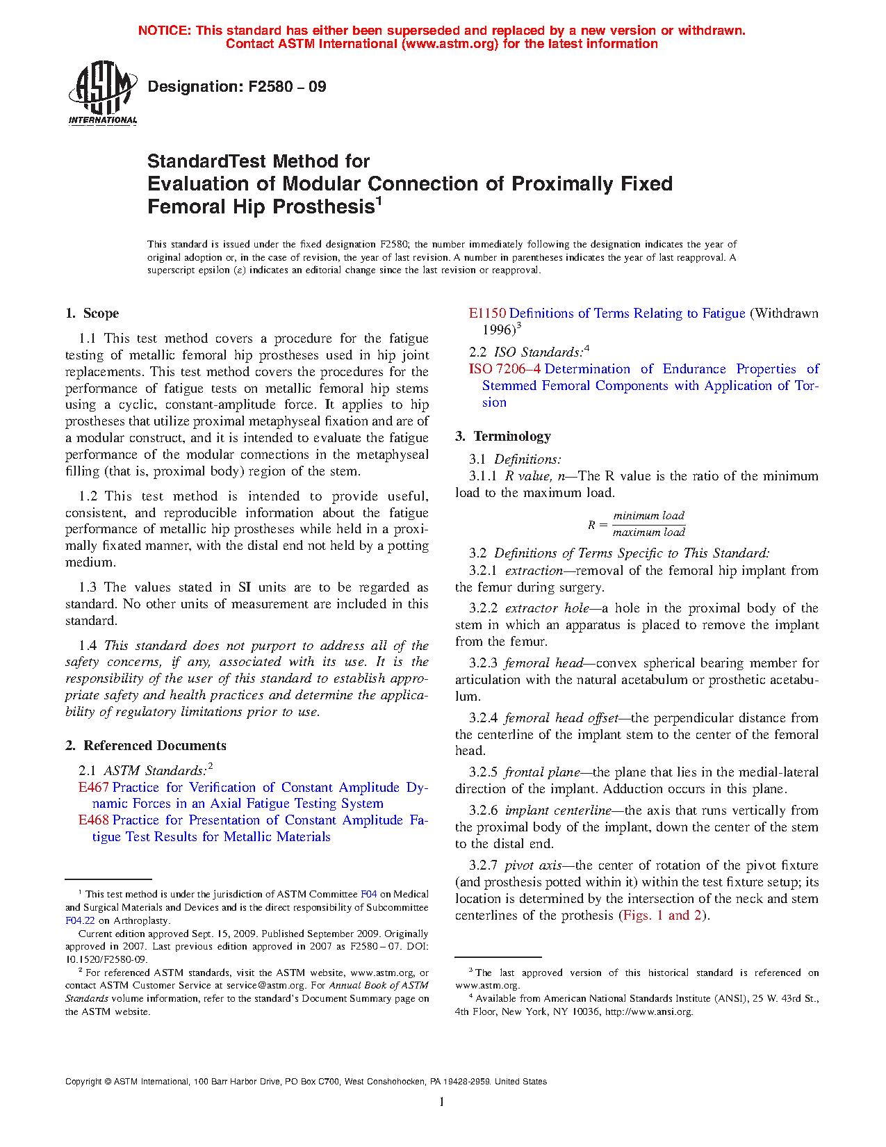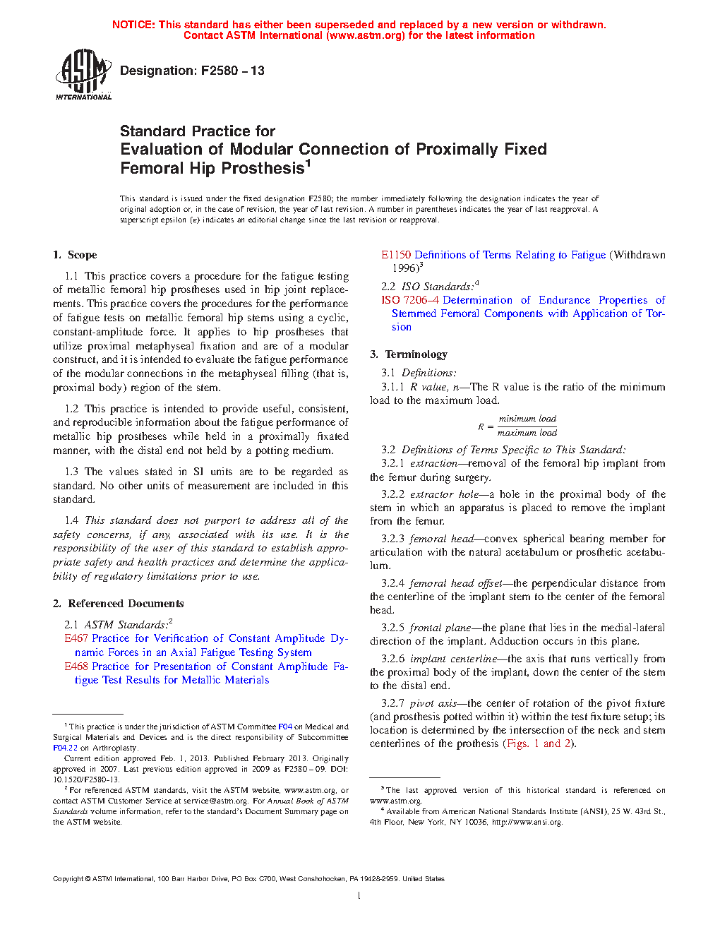 1.2 This practice is intended to provide useful, consistent, and reproducible information about the fatigue performance of metallic hip prostheses while held in a proximally fixated manner, with the distal end not held by a potting medium.
