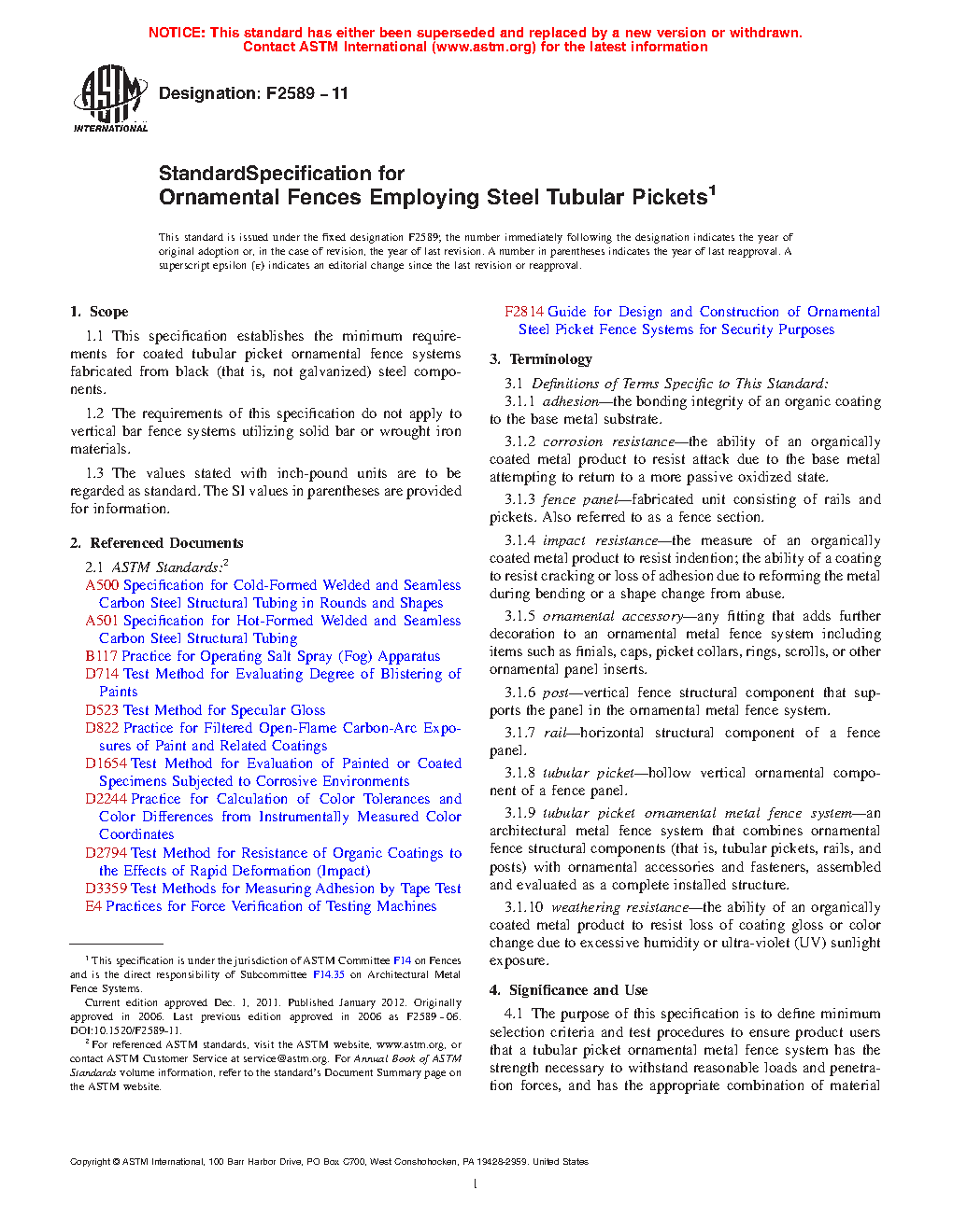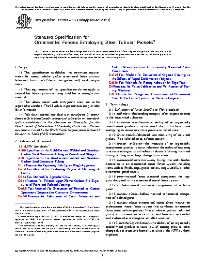 1.1 This specification establishes the minimum requirements for coated tubular picket ornamental fence systems fabricated from black (that is, not galvanized) steel components.