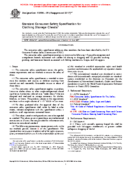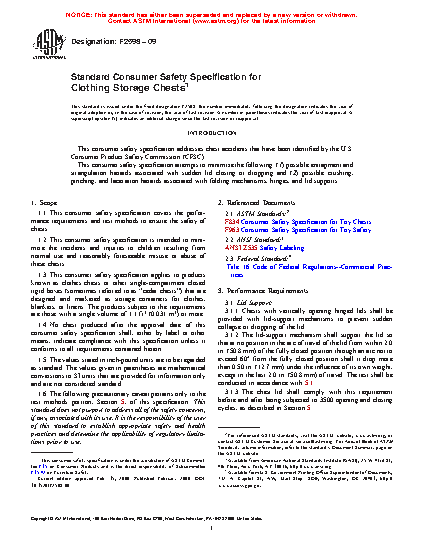 1.1 This consumer safety specification covers the performance requirements and test methods to ensure the safety of chests.