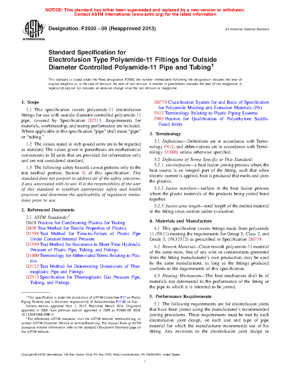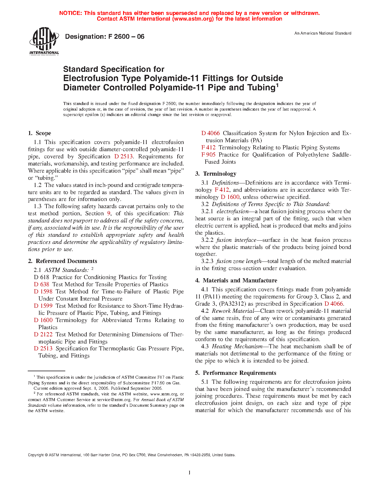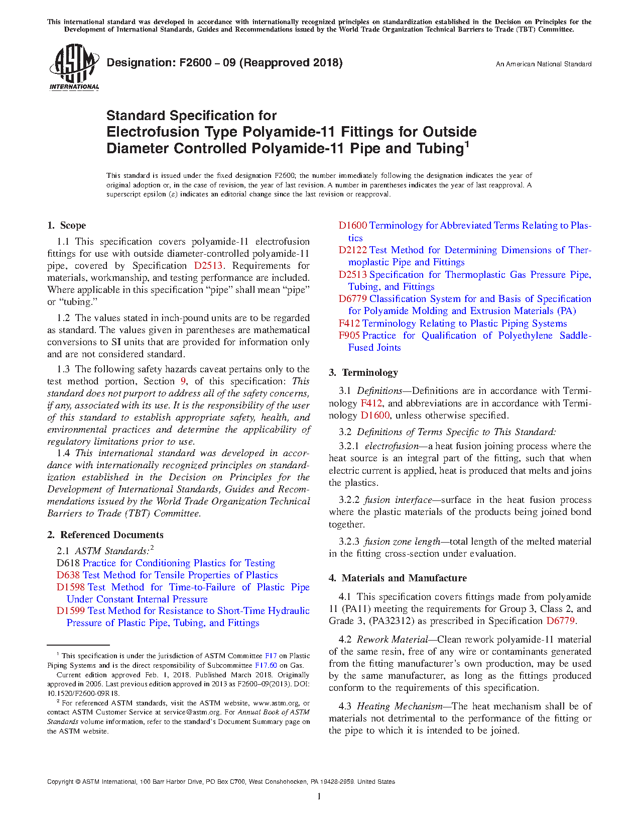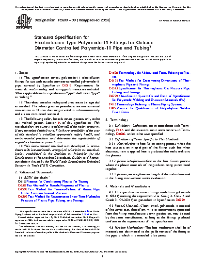 1.1 This specification covers polyamide-11 electrofusion fittings for use with outside diameter-controlled polyamide-11 pipe, covered by Specification D2513. Requirements for materials, workmanship, and testing performance are included. Where applicable in this specification “pipe” shall mean “pipe” or “tubing.”