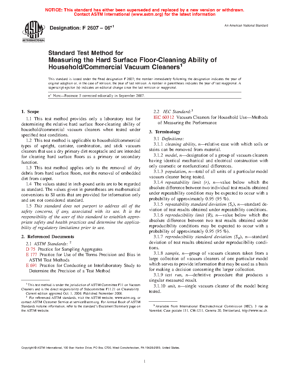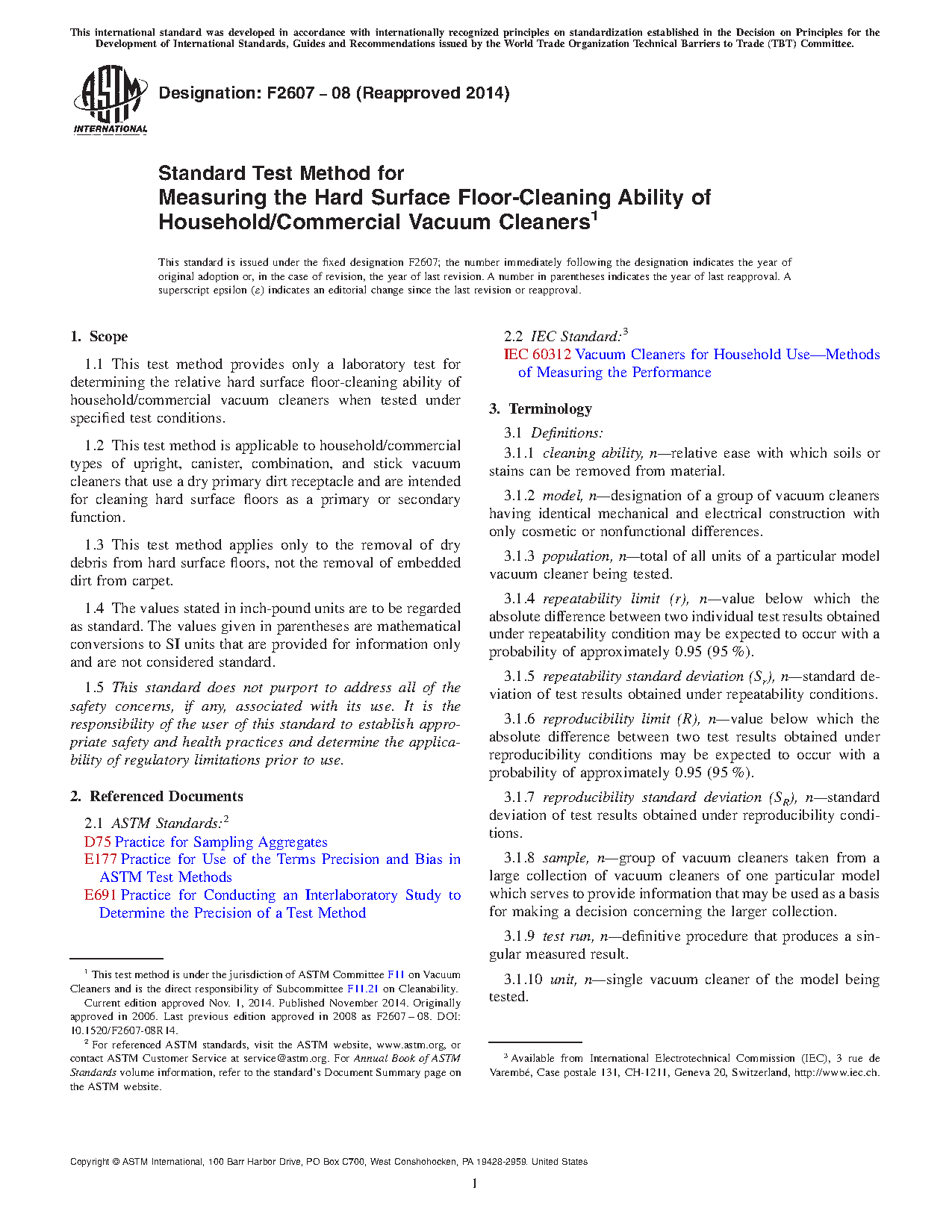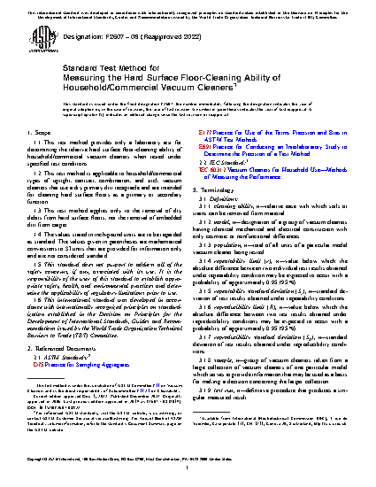 1.1 This test method provides only a laboratory test for determining the relative hard surface floor-cleaning ability of household/commercial vacuum cleaners when tested under specified test conditions.