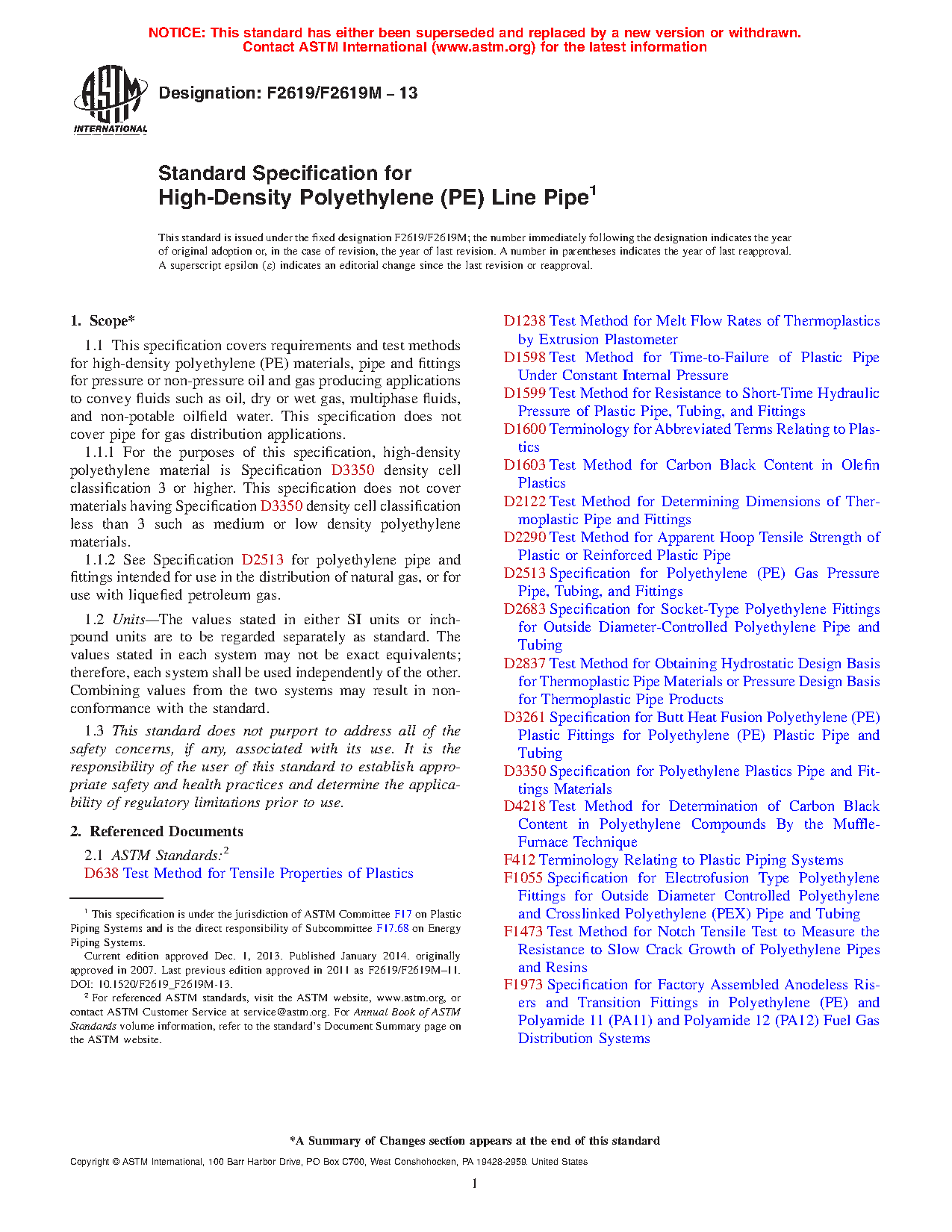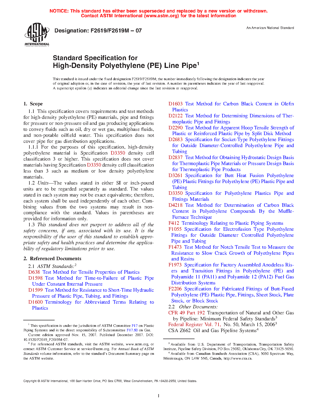 1.1 This specification covers requirements and test methods for high-density polyethylene (PE) materials, pipe and fittings for pressure or non-pressure oil and gas producing applications to convey fluids such as oil, dry or wet gas, multiphase fluids, and non-potable oilfield water. This specification does not cover pipe for gas distribution applications.