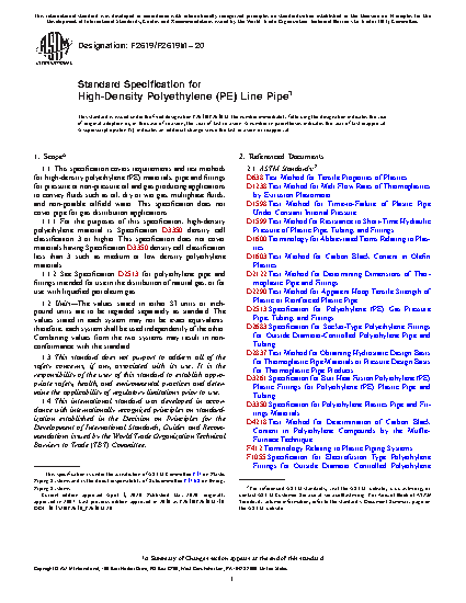 This specification covers the requirements and test methods for high-density polyethylene (PE) materials, line pipes, and fittings used in pressure or non-pressure oil and gas producing applications to convey fluids such as oil, dry or wet gas, multiphase fluids, and non-potable oilfield water. This specification does not apply to pipes for gas distribution applications. PE material compounds suitable for use in the manufacture of pipes and fittings under this specification shall adhere to values of the following properties: density (natural base resin), melt index, flexural modulus, tensile strength at yield, SCG resistance, hydrostatic strength, color and UV stabilization, hydrostatic design stress, and hydrostatic design basis. The line pipes shall meet specific requirements as to workmanship, dimensions (outside diameter, toe-in, outside surface irregularity, ovality, wall thickness, and special sizes), inside surface ductility, tensile elongation, bendback resistance, elevated temperature sustained pressure, short-term strength and pressurization, apparent tensile strength at yield, and carbon black content. And conversely, PE fittings shall be manufactured in accordance with their intended use with correspondingly sized PE line pipes, as follows: socket fusion fittings, butt fusion fittings, electrofusion fittings, fabricated fittings, and transition fittings.