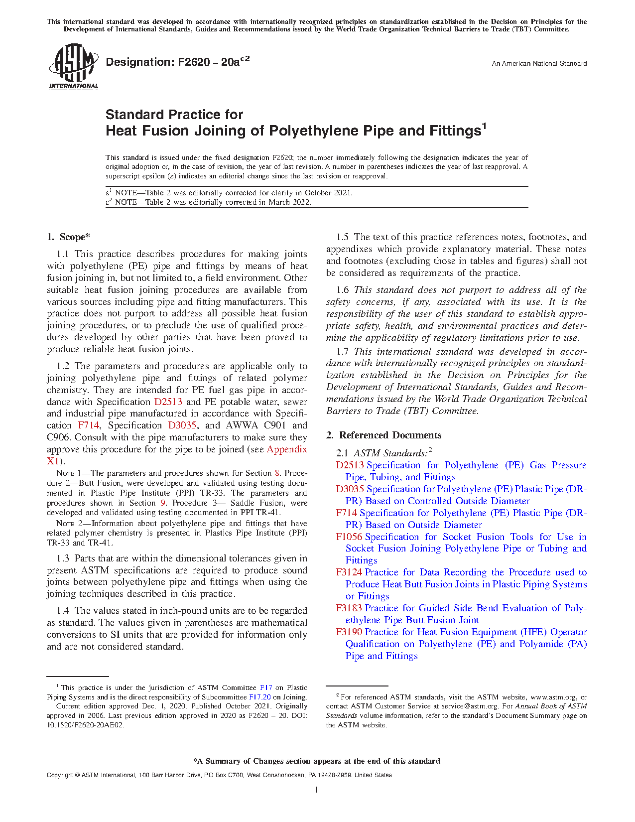 1.2 The parameters and procedures are applicable only to joining polyethylene pipe and fittings of related polymer chemistry. They are intended for PE fuel gas pipe in accordance with Specification D2513 and PE potable water, sewer and industrial pipe manufactured in accordance with Specification F714, Specification D3035, and AWWA C901 and C906. Consult with the pipe manufacturers to make sure they approve this procedure for the pipe to be joined (see Appendix X1).