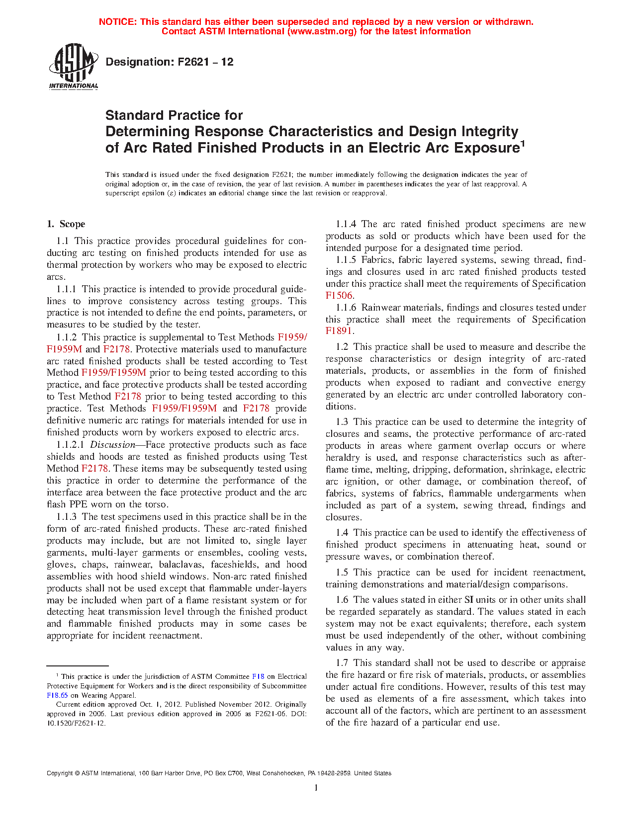 1.1.2 This practice is supplemental to Test Methods F1959/F1959M and F2178. Protective materials used to manufacture arc rated finished products shall be tested according to Test Method F1959/F1959M prior to being tested according to this practice, and face protective products shall be tested according to Test Method F2178 prior to being tested according to this practice. Test Methods F1959/F1959M and F2178 provide definitive numeric arc ratings for materials intended for use in finished products worn by workers exposed to electric arcs.