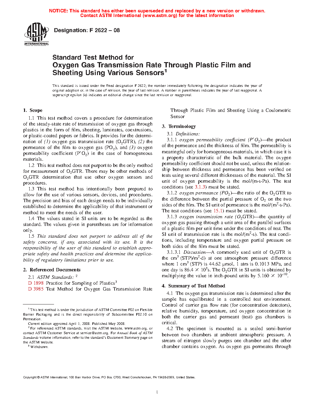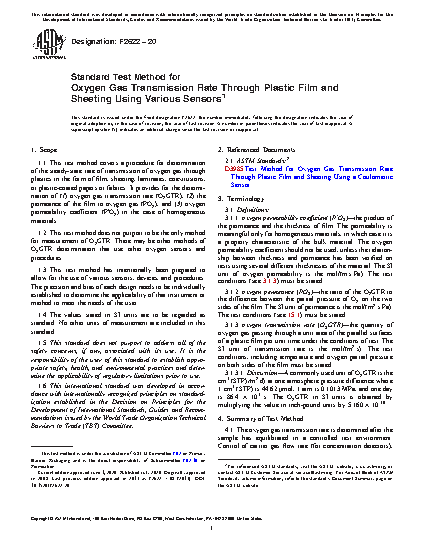 1.1 This test method covers a procedure for determination of the steady-state rate of transmission of oxygen gas through plastics in the form of film, sheeting, laminates, coextrusions, or plastic-coated papers or fabrics. It provides for the determination of (1) oxygen gas transmission rate (O2GTR), (2) the permeance of the film to oxygen gas (PO2), and (3) oxygen permeability coefficient (P′O2) in the case of homogeneous materials.