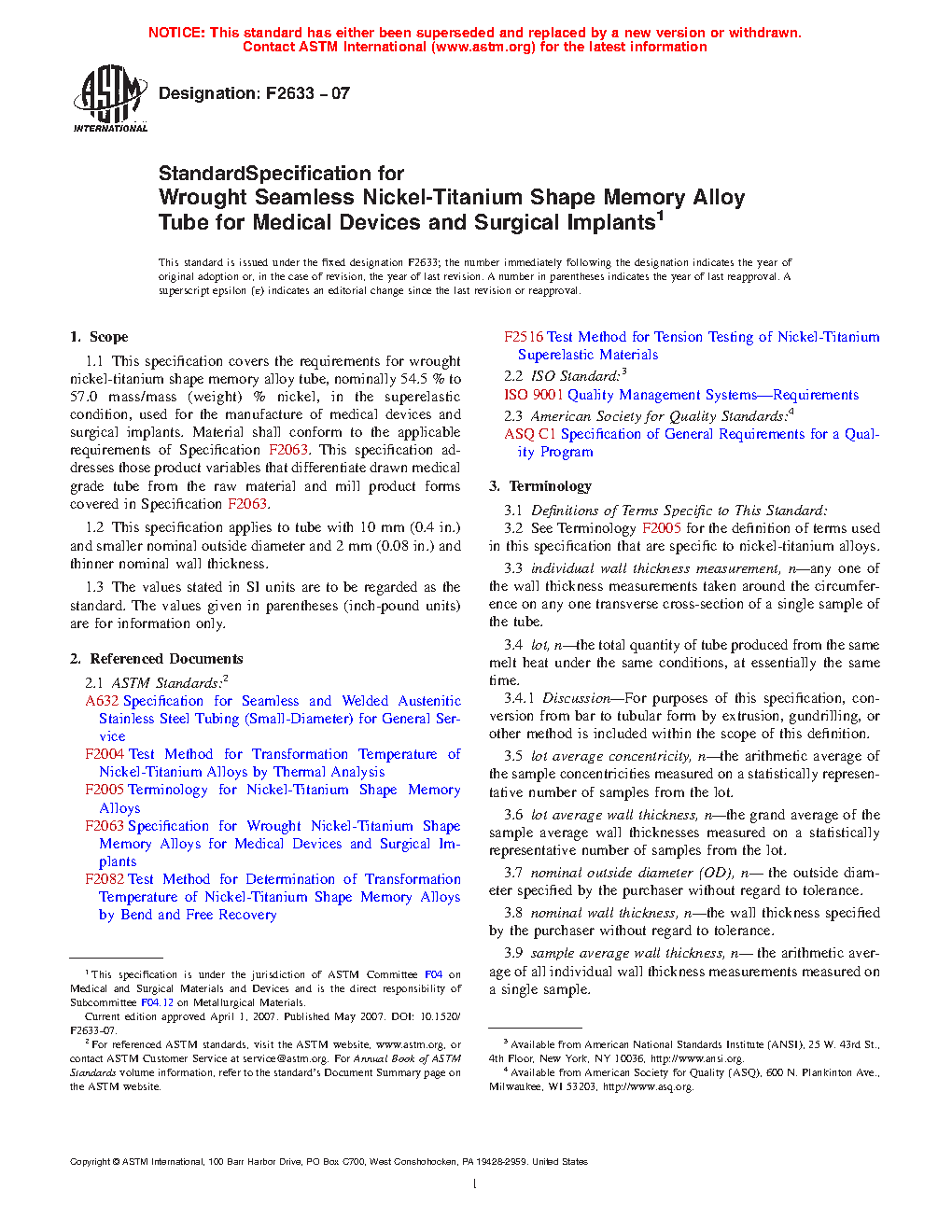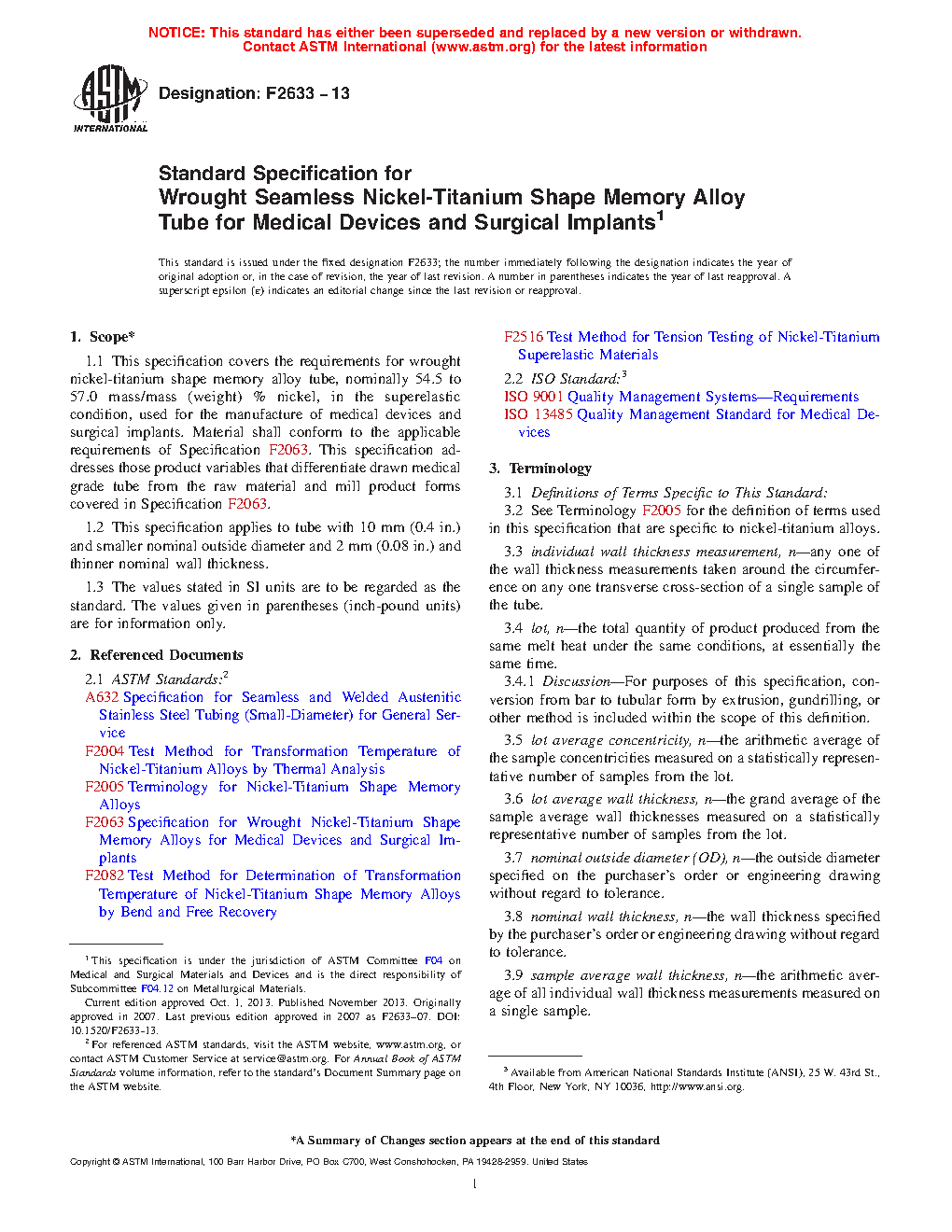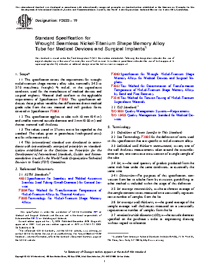 This specification covers the chemical, mechanical, and dimensional requirements for wrought seamless nickel-titanium shape memory alloy tubes used for the manufacture of medical devices and surgical implants. Tubes shall be furnished in the superelastic condition, and the outer surface shall have a pickled, ground, or mechanically polished finish, or as agreed upon between purchaser and supplier. This specification addresses those product variables that differentiate drawn medical grade tube from the raw material and mill product forms. This specification applies precisely to tube with 10 mm (0.4 in.) and smaller nominal outside diameter and 2 mm (0.08 in.) and thinner nominal wall thickness. The mechanical properties to which the tubes shall conform are ultimate tensile strength (UTS), uniform elongation, upper plateau strength, lower plateau strength, and residual elongation.