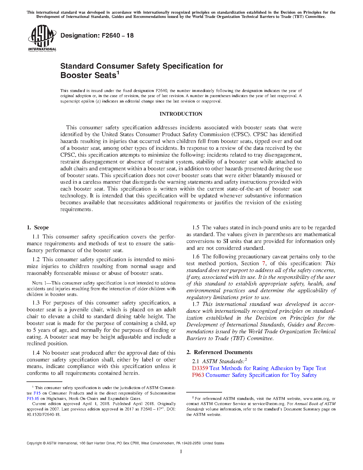 1.1 This consumer safety specification covers the performance requirements and methods of test to ensure the satisfactory performance of the booster seat.