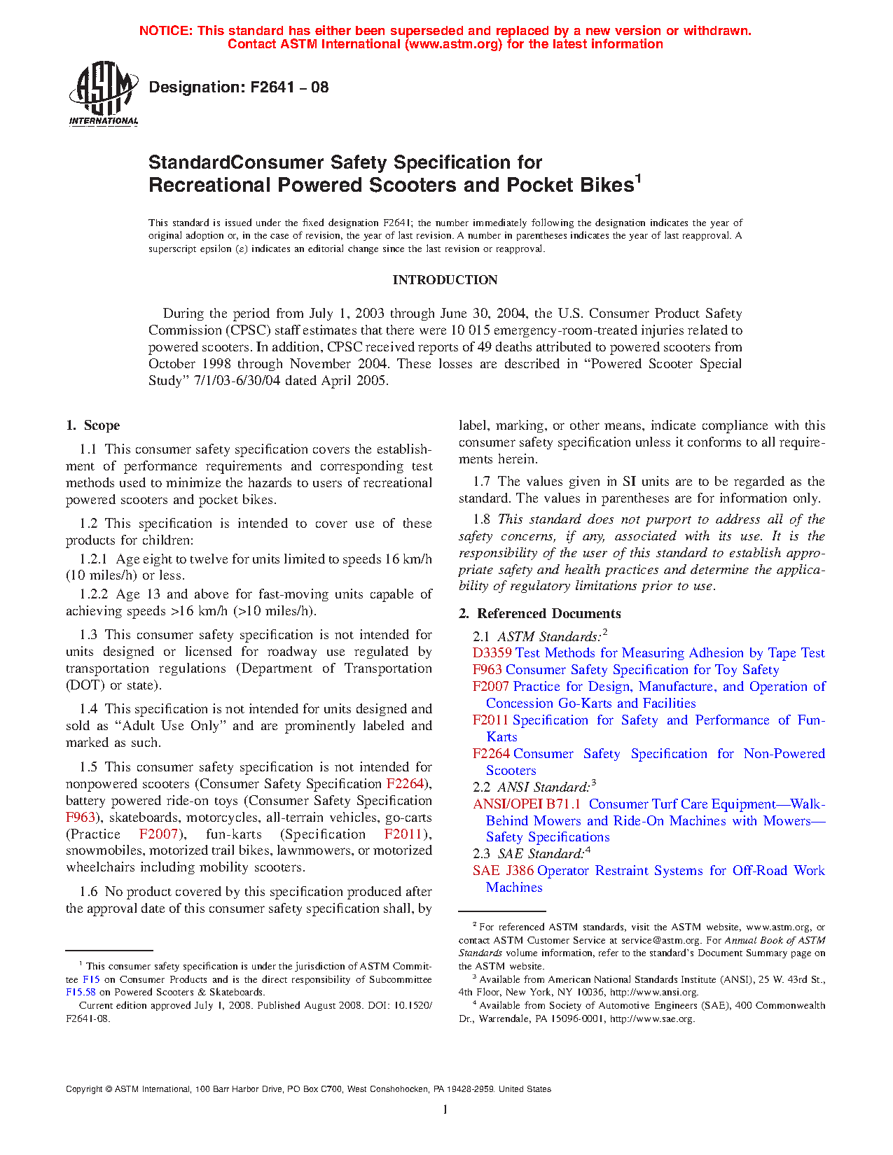 1.1 This consumer safety specification covers the establishment of performance requirements and corresponding test methods used to minimize the hazards to users of recreational powered scooters and pocket bikes.