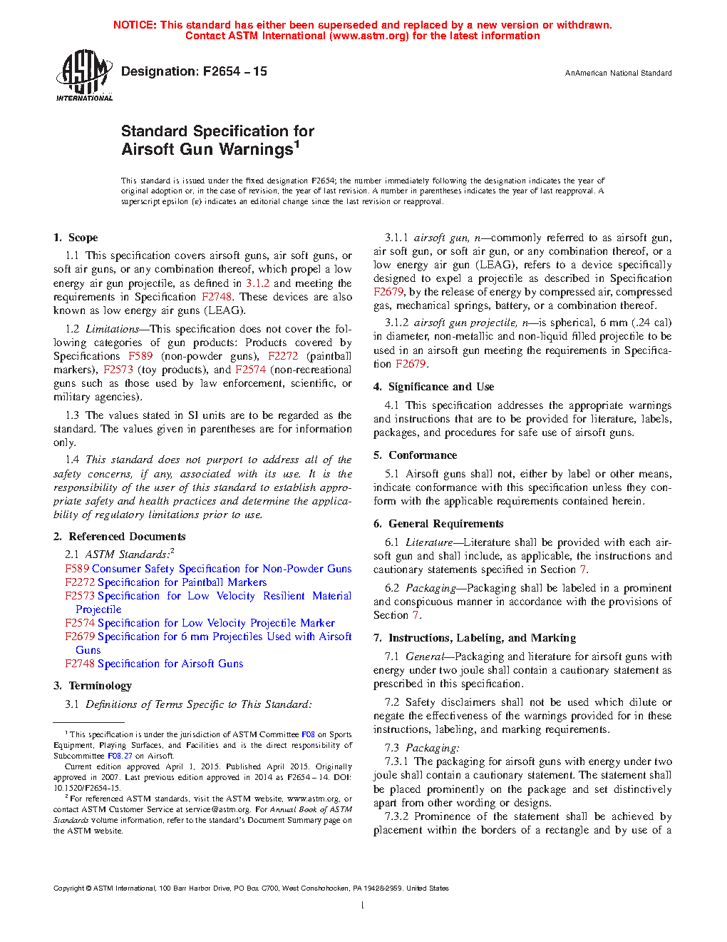 This specification covers low energy air guns (LEAG), commonly referred to as airsoft guns, air soft guns, or soft air guns, or any combination thereof, which propel a low energy air gun projectile. Non-powder guns, paintball markers, toy products, non-recreational guns such as those used by law enforcement, scientific, or military agencies are not covered by this specification. The appropriate warnings and instructions that are to be provided for literature, labels, packages, and procedures for safe use of low energy air guns are addressed in this specification. Literature shall be provided with each low energy air gun and shall include, as applicable, the prescribed instructions and cautionary statements. Packaging shall be labeled in a prominent and conspicuous manner as prescribed. Safety disclaimers shall not be used which dilute or negate the effectiveness of the warnings provided for in these instructions, labeling, and marking requirements.