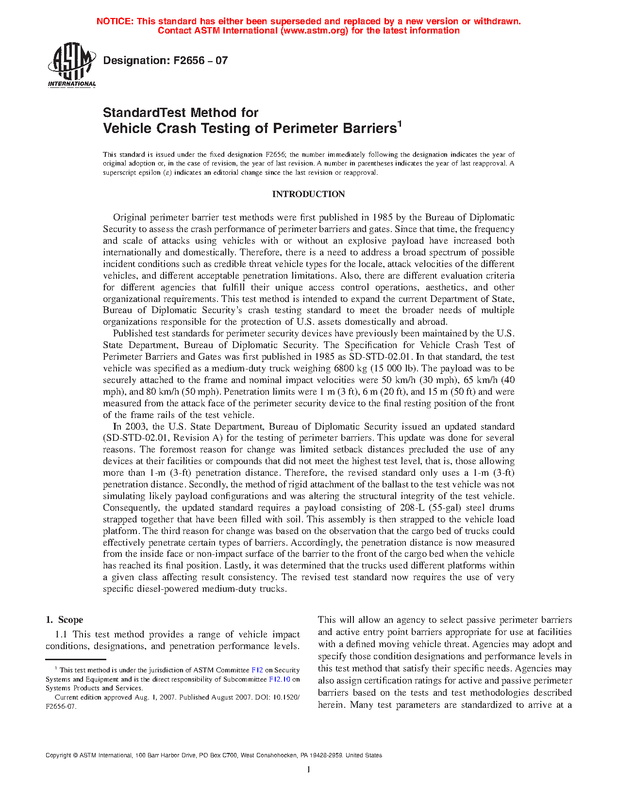 This test method provides a structured procedure to establish a penetration rating for perimeter barriers subjected to a vehicle impact. Knowing the penetration rating provides the ability to select an appropriate barrier for site-specific conditions around a facility.
