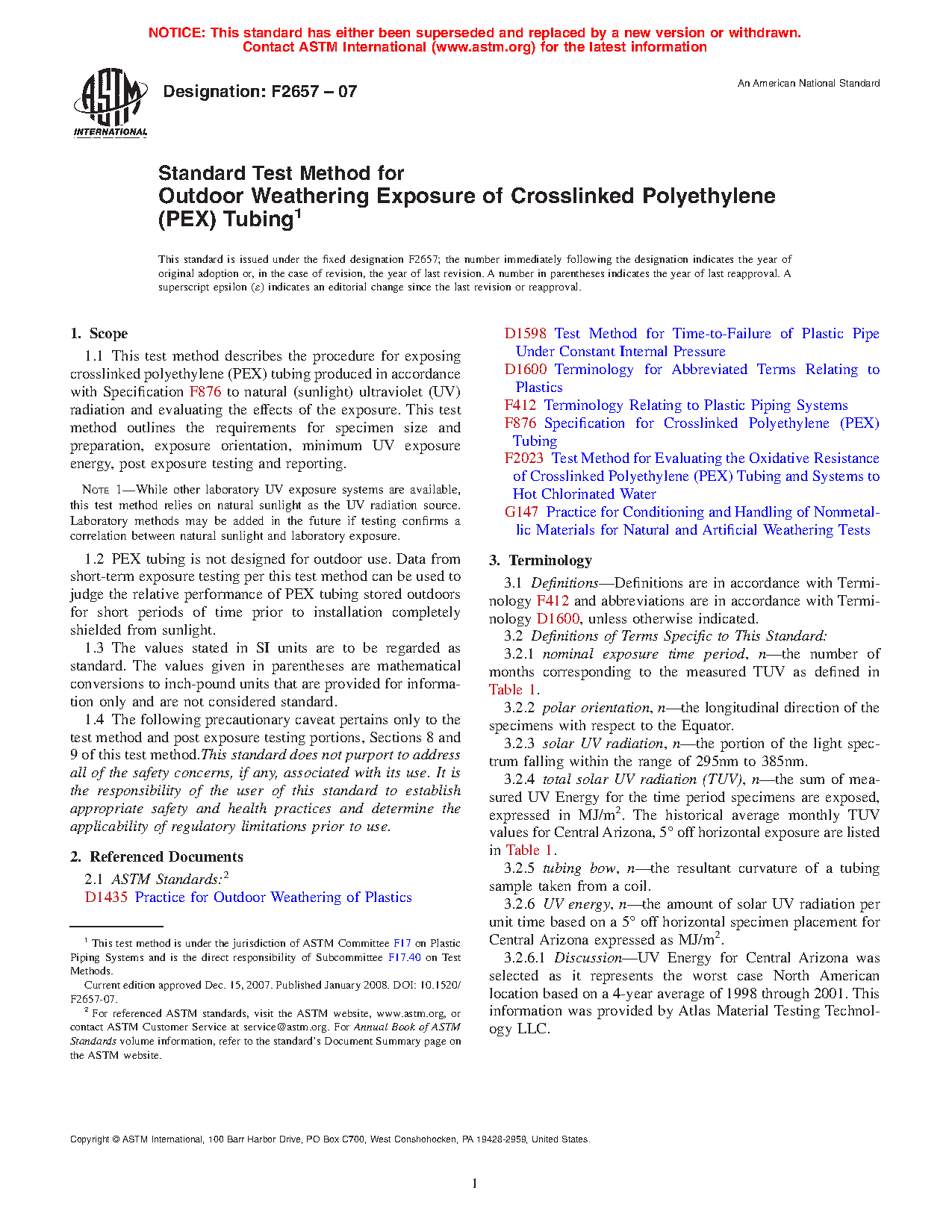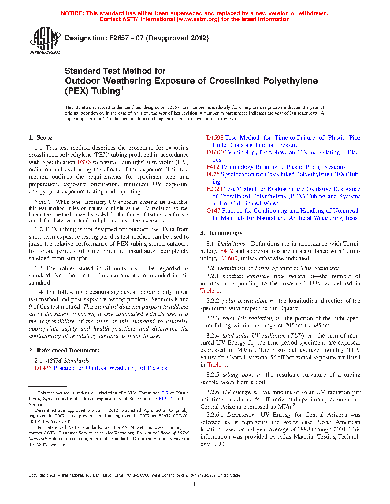 1.2 PEX tubing is not designed for outdoor use. Data from short-term exposure testing per this test method can be used to judge the relative performance of PEX tubing stored outdoors for short periods of time prior to installation completely shielded from sunlight.