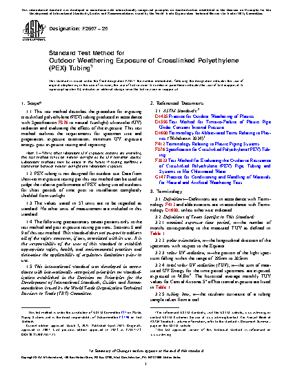 1.1 This test method describes the procedure for exposing crosslinked polyethylene (PEX) tubing produced in accordance with Specification F876 to natural (sunlight) ultraviolet (UV) radiation and evaluating the effects of the exposure. This test method outlines the requirements for specimen size and preparation, exposure orientation, minimum UV exposure energy, post exposure testing and reporting.
