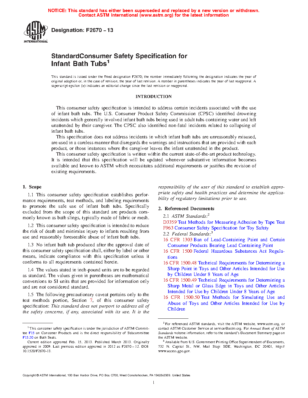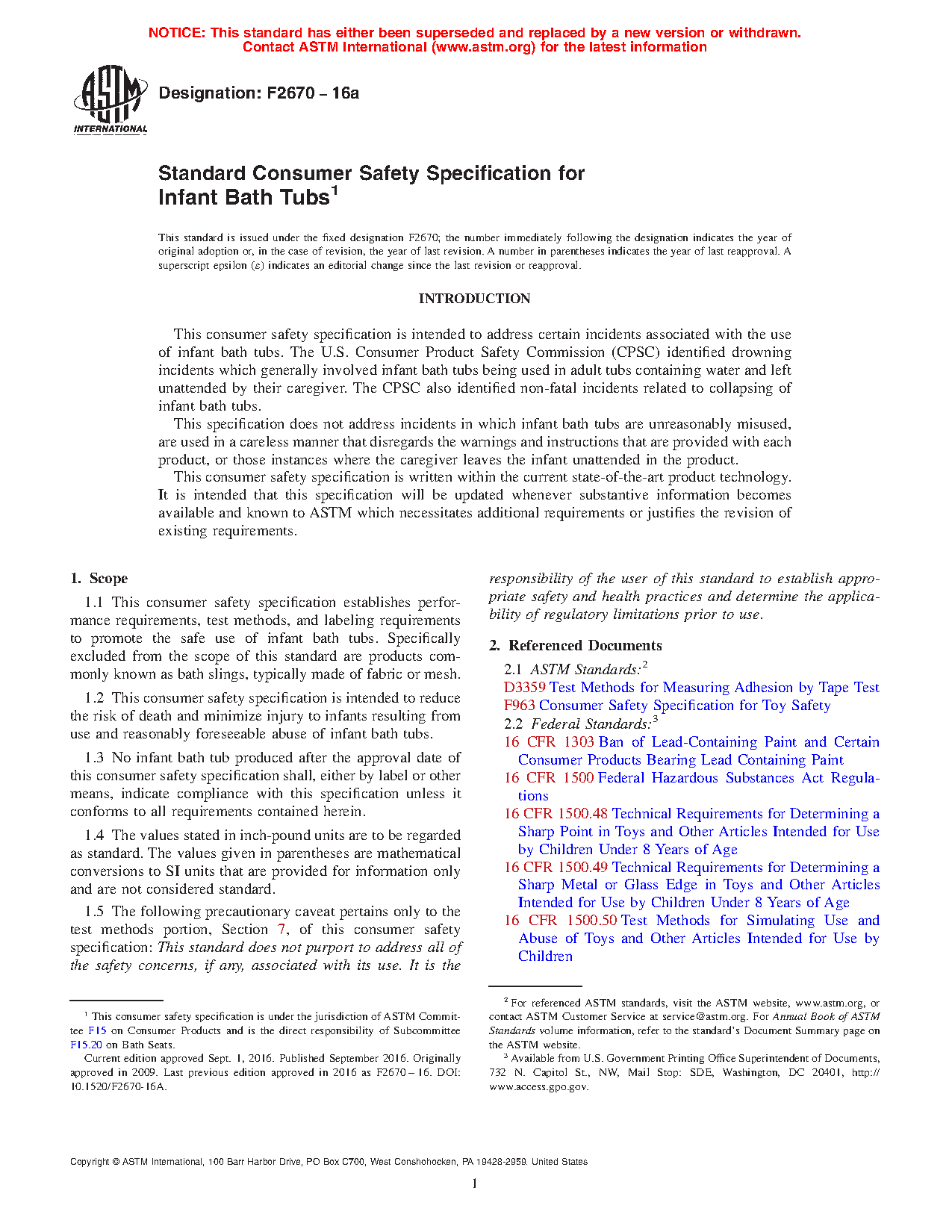 1.1 This consumer safety specification establishes performance requirements, test methods, and labeling requirements to promote the safe use of infant bath tubs. Specifically excluded from the scope of this standard are products commonly known as bath slings, typically made of fabric or mesh.