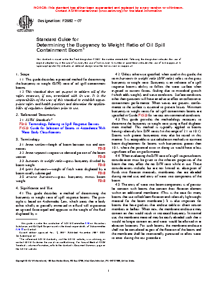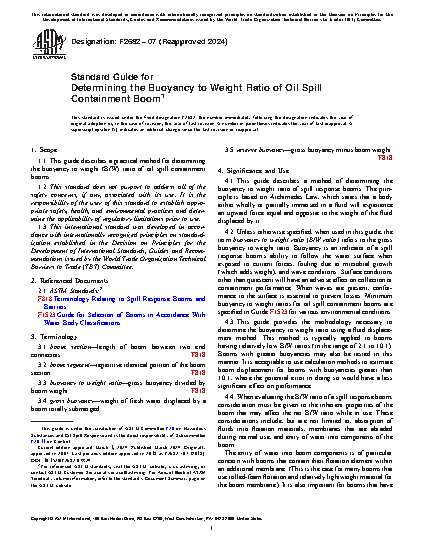 Standard Guide for Determining the Buoyancy to Weight Ratio of Oil Spill Containment Boom