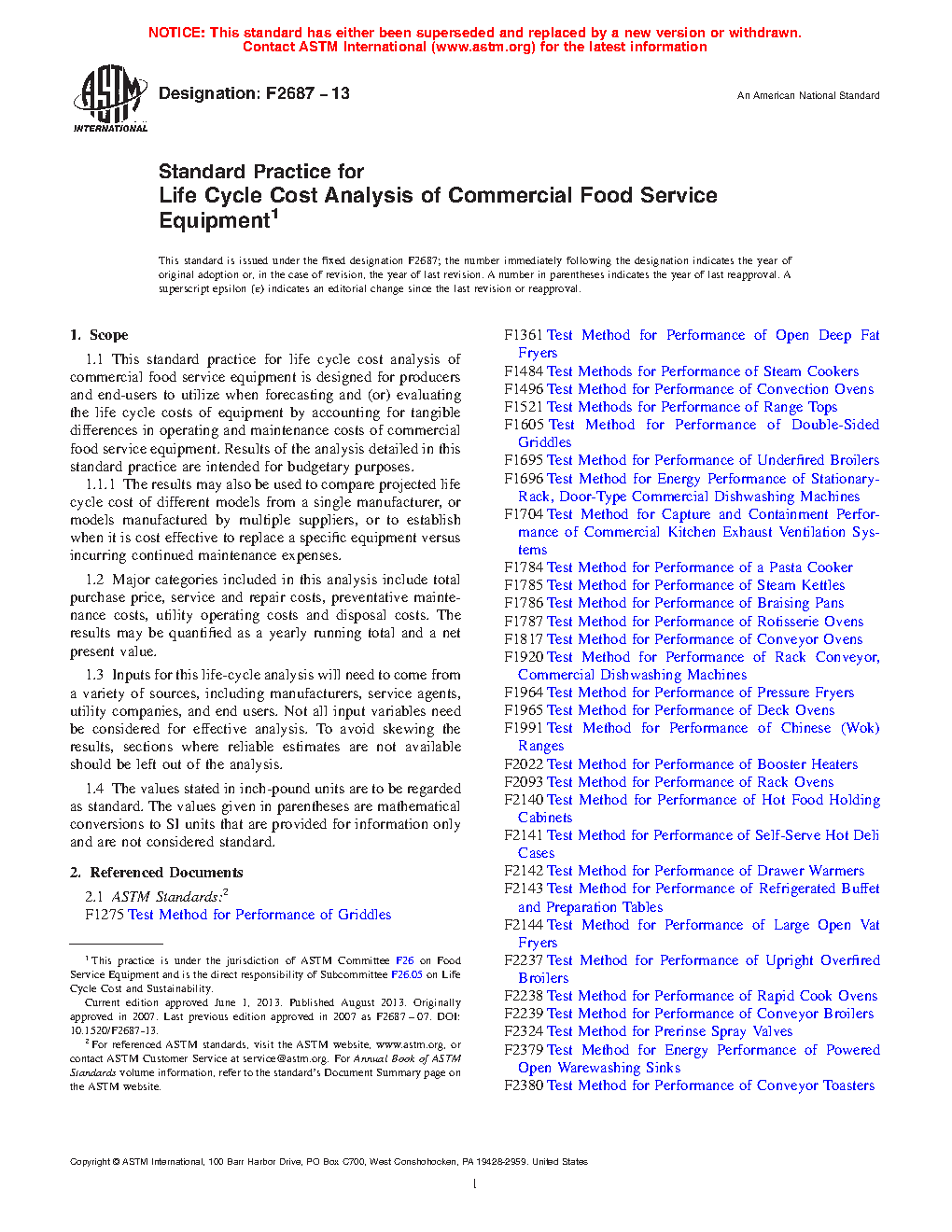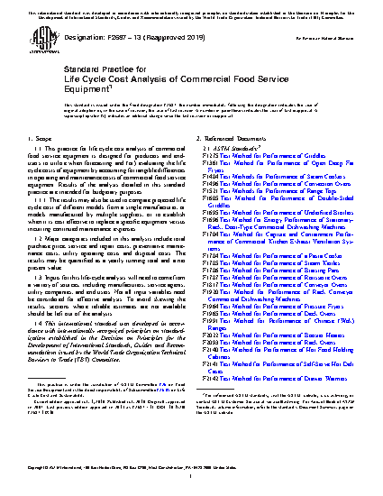 1.1 This standard practice for life cycle cost analysis of commercial food service equipment is designed for producers and end-users to utilize when forecasting and (or) evaluating the life cycle costs of equipment by accounting for tangible differences in operating and maintenance costs of commercial food service equipment. Results of the analysis detailed in this standard practice are intended for budgetary purposes.