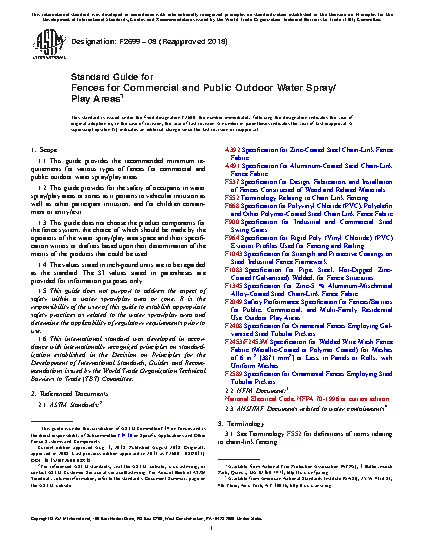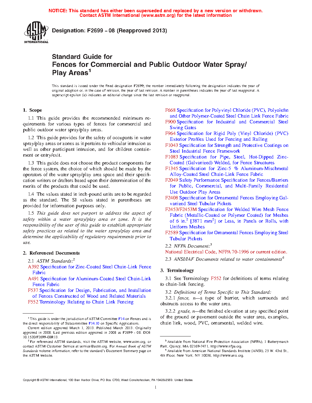 1.1 This guide provides the recommended minimum requirements for various types of fences for commercial and public outdoor water spray/play areas.