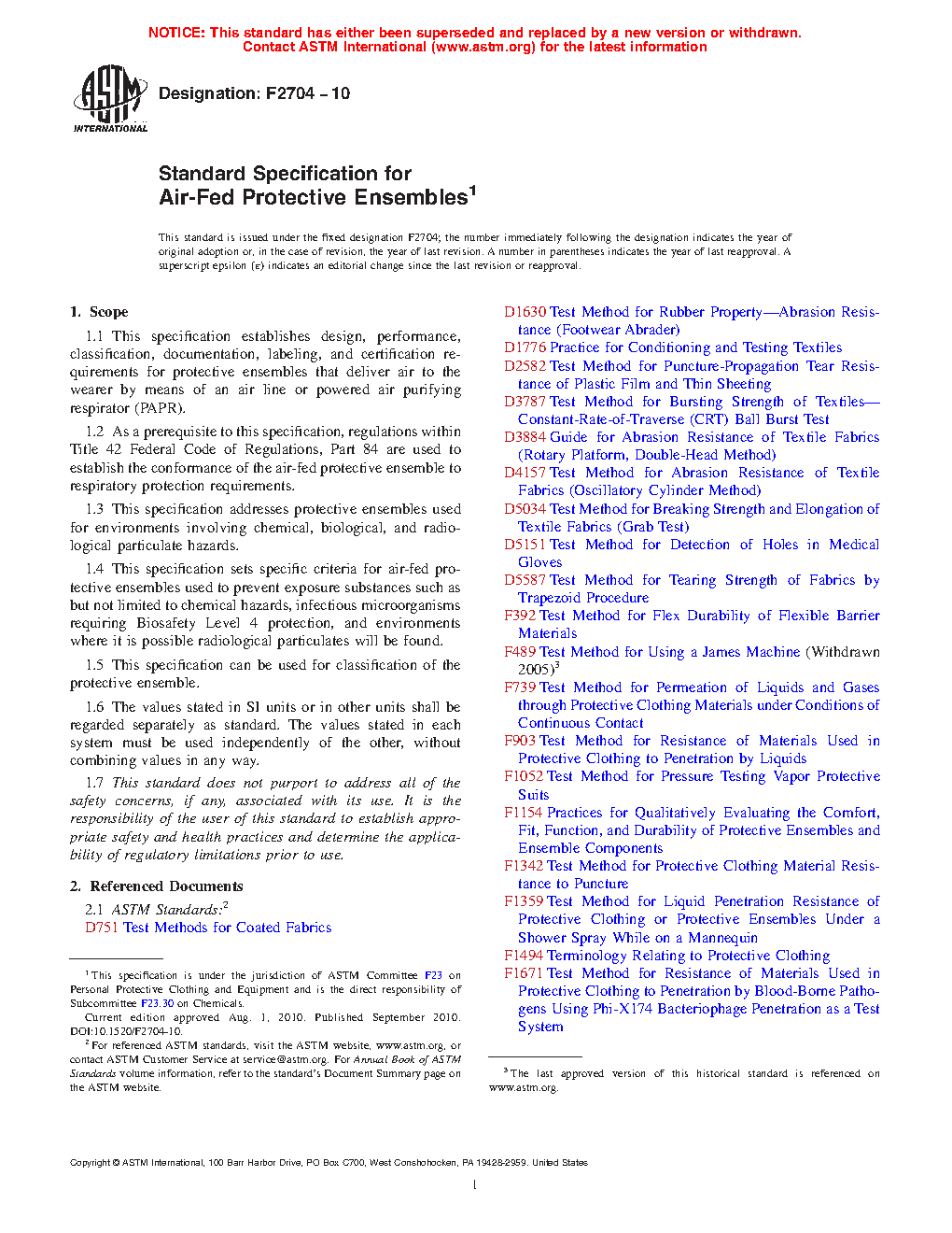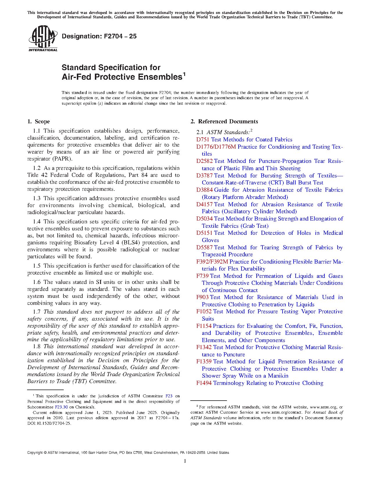 1.1 This specification establishes design, performance, classification, documentation, labeling, and certification requirements for protective ensembles that deliver air to the wearer by means of an air line or powered air purifying respirator (PAPR).