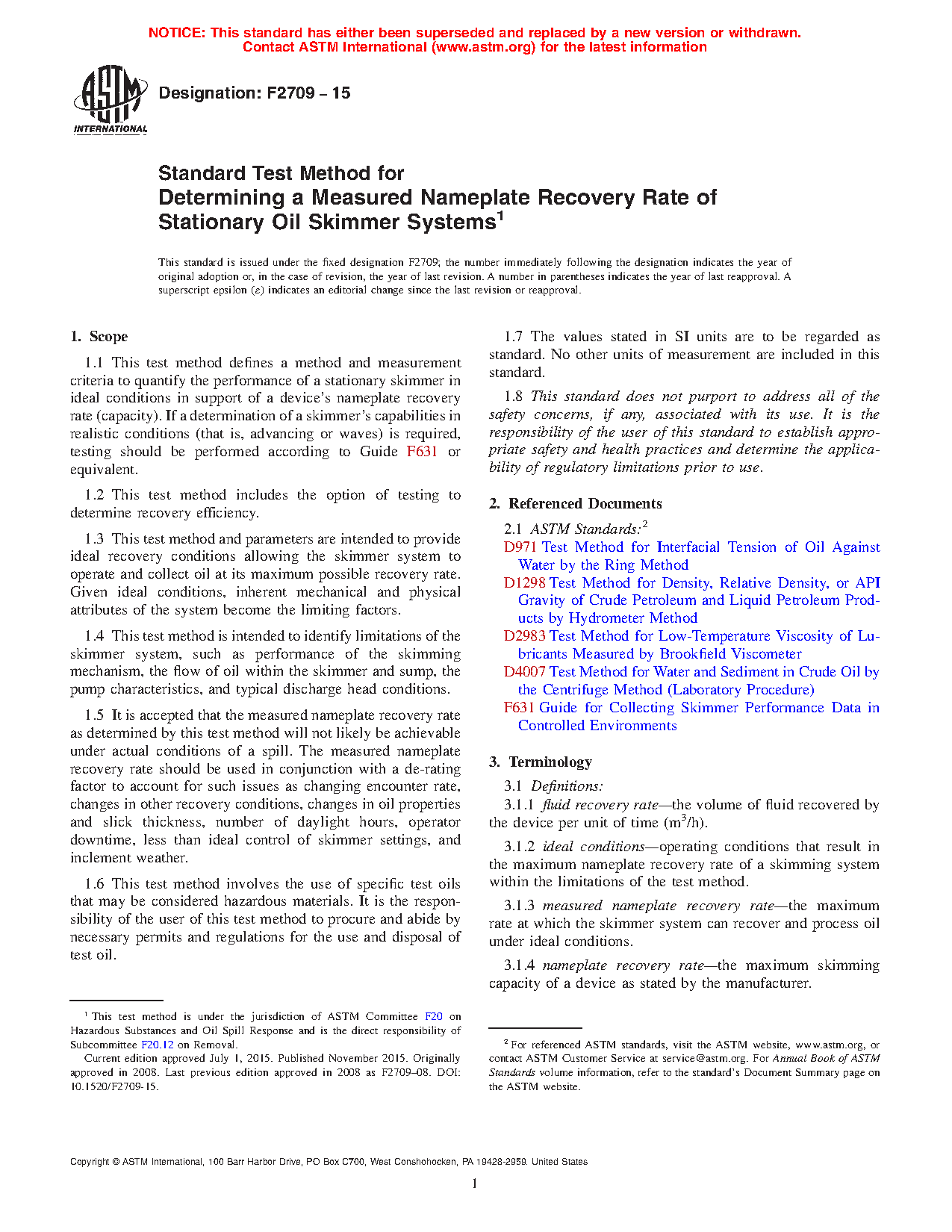 1.3 This test method and parameters are intended to provide ideal recovery conditions allowing the skimmer system to operate and collect oil at its maximum possible recovery rate. Given ideal conditions, inherent mechanical and physical attributes of the system become the limiting factors.