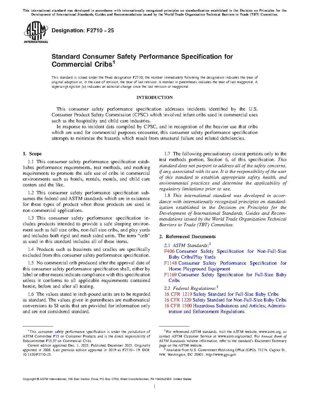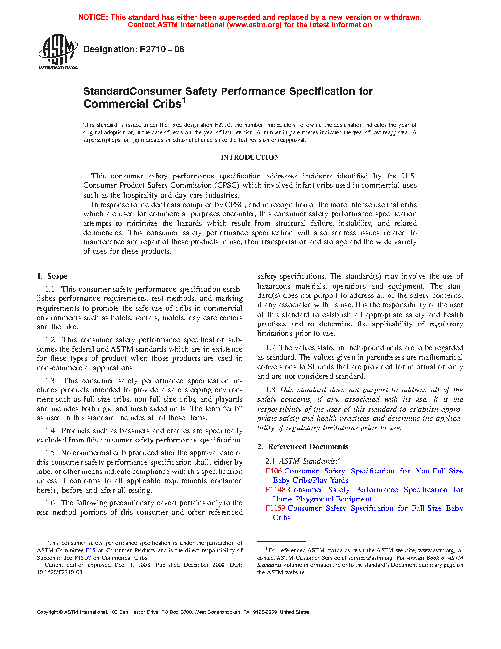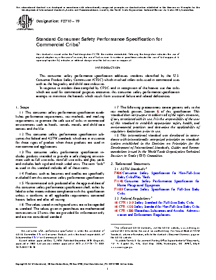 1.1 This consumer safety performance specification establishes performance requirements, test methods, and marking requirements to promote the safe use of cribs in commercial environments such as hotels, rentals, motels, and child care centers and the like.