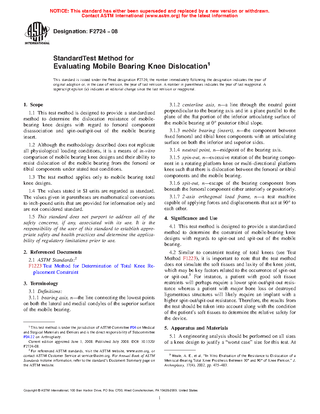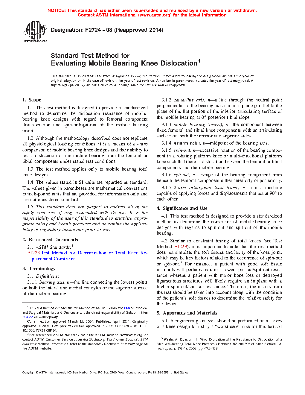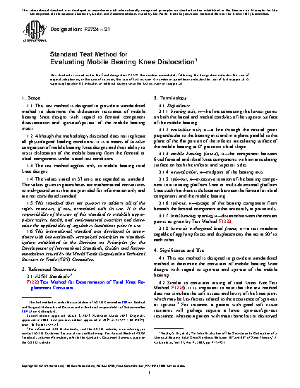 1.1 This test method is designed to provide a standardized method to determine the dislocation resistance of mobile bearing knee designs with regard to femoral component disassociation and spin-out/spit-out of the mobile bearing insert.