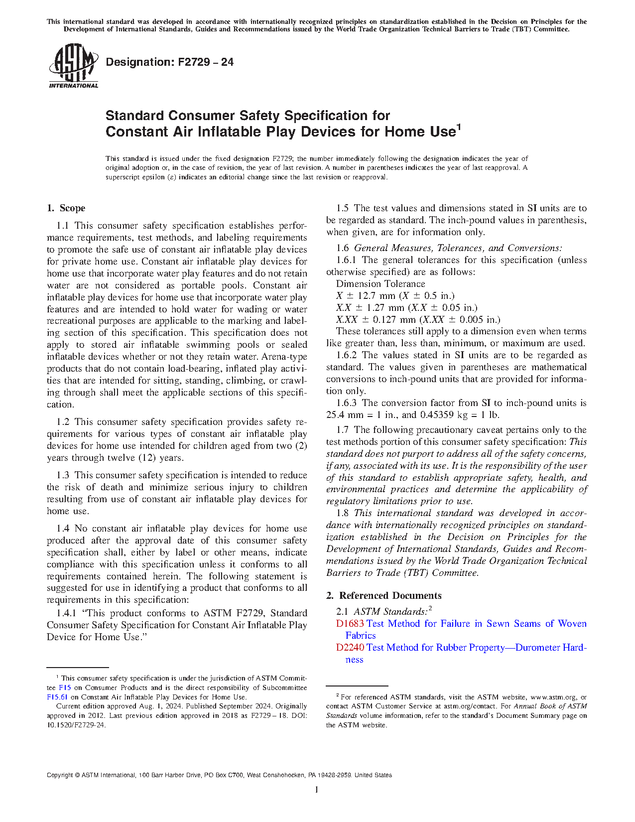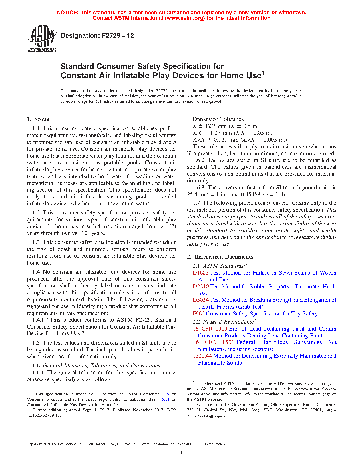 1.4.1 “This product conforms to ASTM F2729, Standard Consumer Safety Specification for Constant Air Inflatable Play Device for Home Use.”