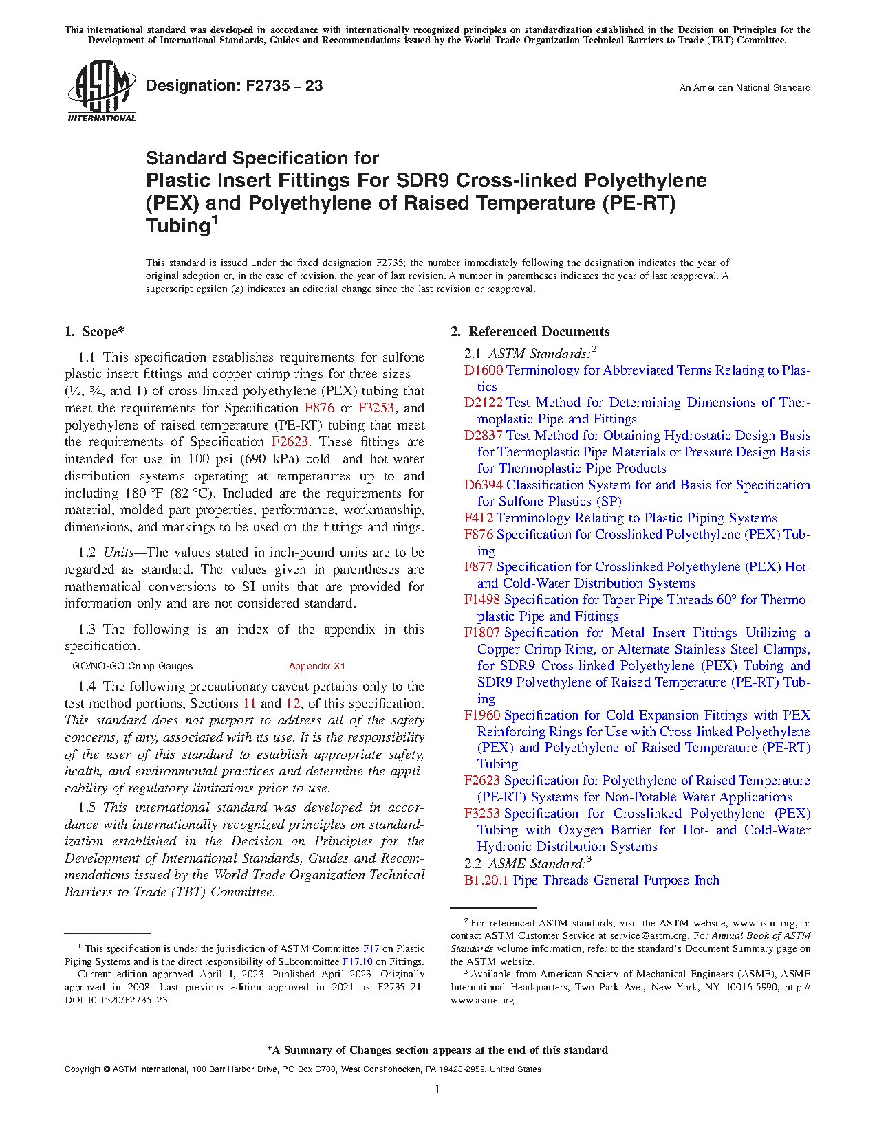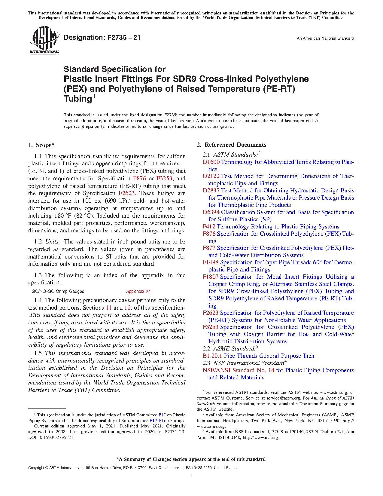( ½, ¾, and 1) of cross-linked polyethylene (PEX) and polyethylene of raised temperature (PE-RT) plastic tubing. These fittings are intended for use in 100 psi (690 kPa) cold- and hot-water distribution systems operating at temperatures up to and including 180°F (82°C). Included are the requirements for material, molded part properties, performance, workmanship, dimensions, and markings to be used on the fittings and rings.