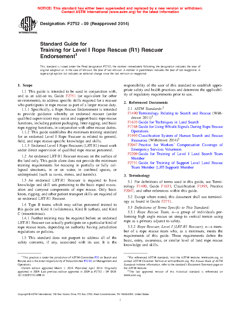 1.1 This guide, in conjunction with, and as an add-on to, Guide F2751 (or equivalent for other environments) defines the basic training required for a person who participates in rope rescue as part of a larger rescue duty.