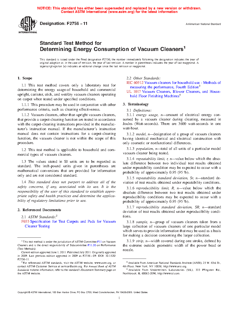1.1 This test method covers only a laboratory test for determining the energy usage-of household and commercial upright, canister, stick, and wet/dry vacuum cleaners operating on carpet when tested under specified conditions.
