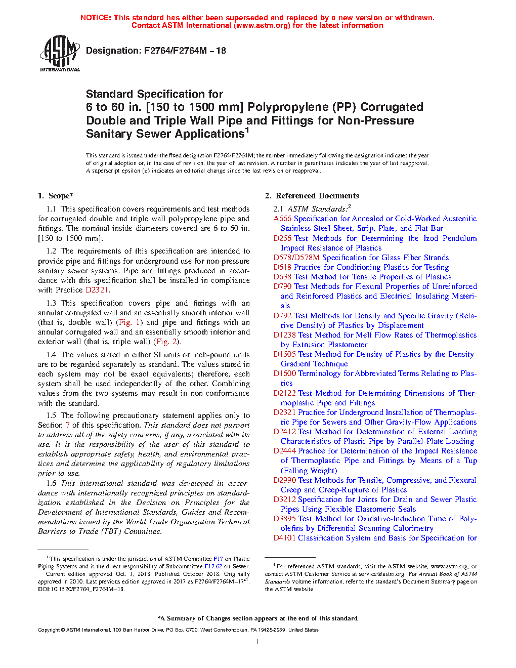 1.1 This specification covers requirements and test methods for corrugated double and triple wall polypropylene pipe and fittings. The nominal inside diameters covered are 6 in. to 60 in. [150 mm to 1500 mm].