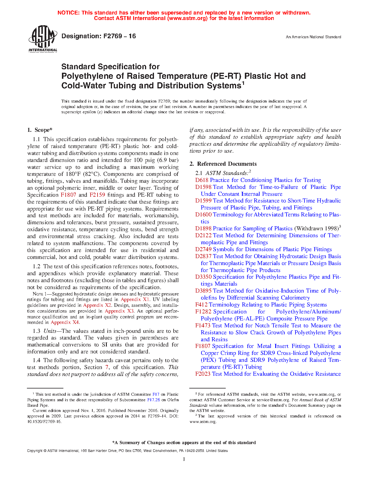 Note 1: Suggested hydrostatic design stresses and hydrostatic pressure ratings for tubing and fittings are listed in Appendix X1. UV labeling guidelines are provided in Appendix X2. Design, assembly, and installation considerations are provided in Appendix X3. An optional performance qualification and an in-plant quality control program are recommended in Appendix X4.