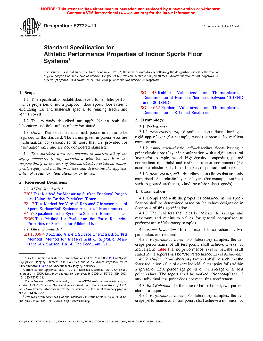 1.1 This specification establishes levels for athletic performance properties of multi-purpose indoor sports floor systems, excluding turf and materials specific to running tracks and tennis courts.