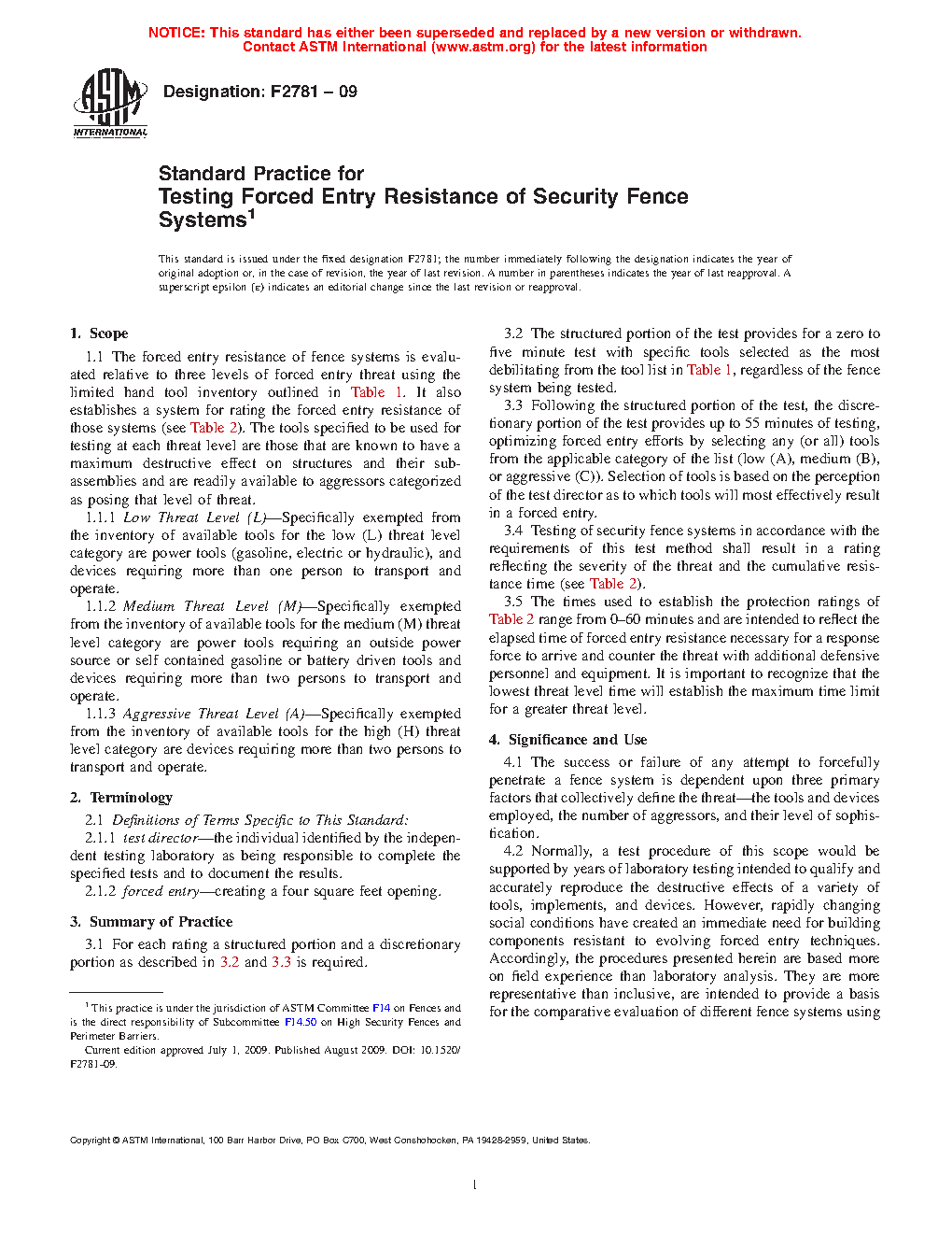 1.1 The forced entry resistance of fence systems is evaluated relative to three levels of forced entry threat using the limited hand tool inventory outlined in Table 1. It also establishes a system for rating the forced entry resistance of those systems (see Table 2). The tools specified to be used for testing at each threat level are those that are known to have a maximum destructive effect on structures and their sub-assemblies and are readily available to aggressors categorized as posing that level of threat.